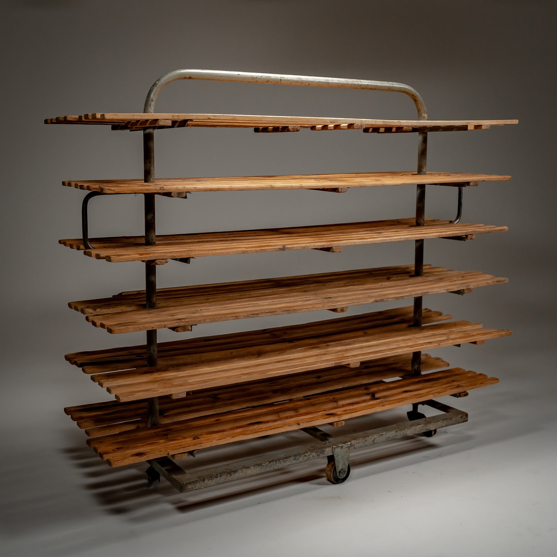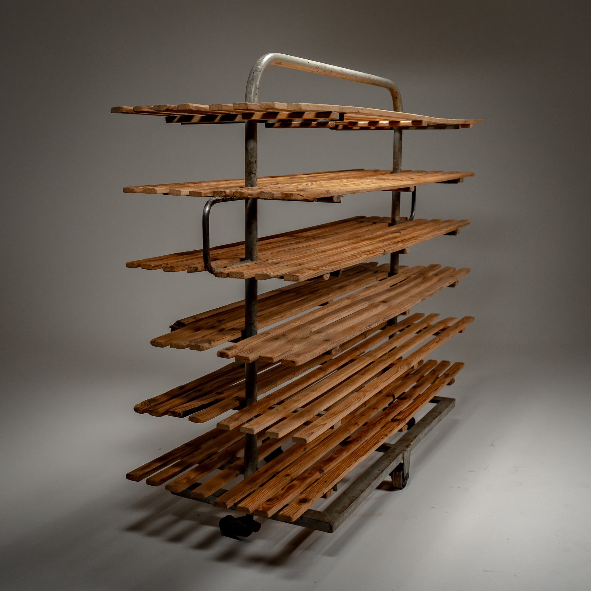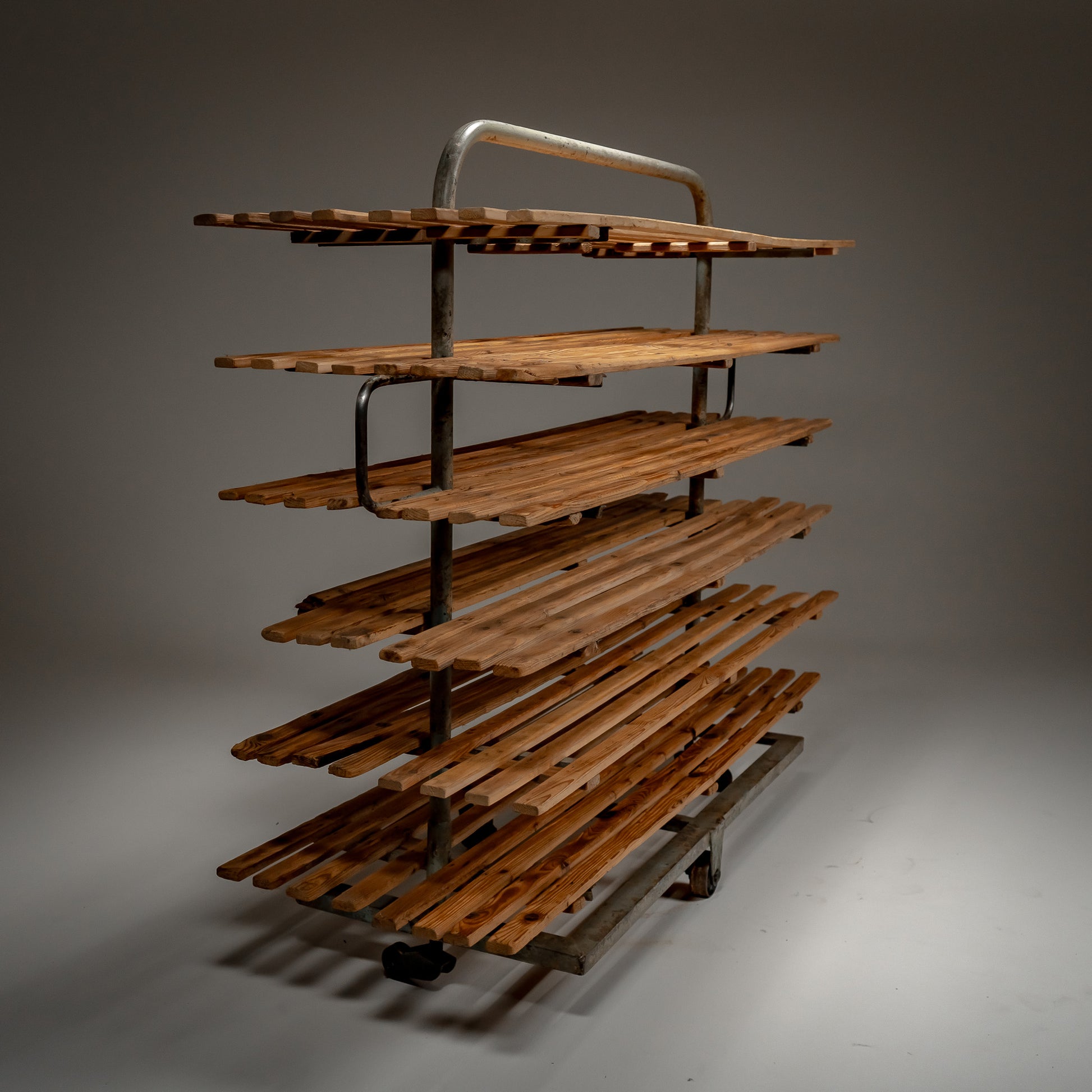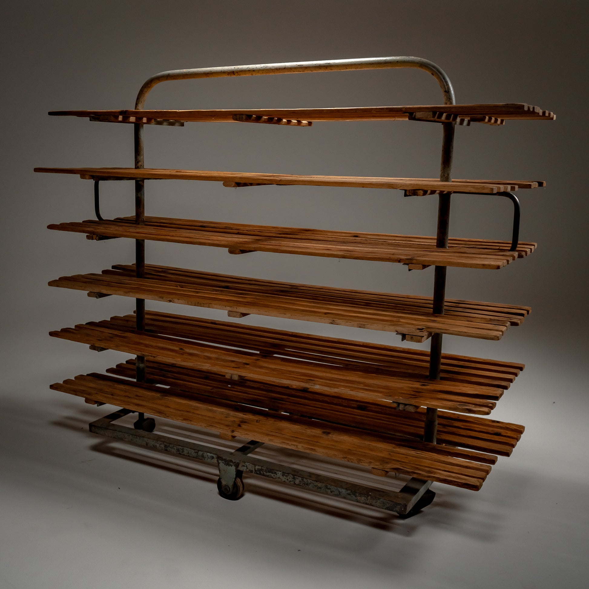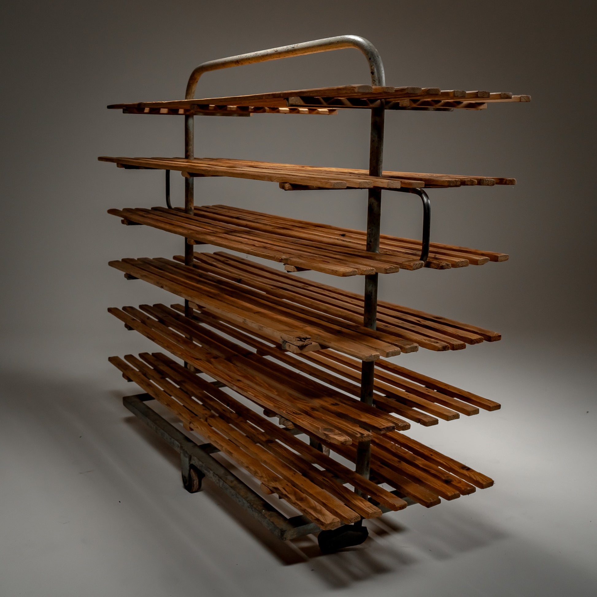 Denne seks-hyllers brødtrallen stammer fra Gdańsk og dateres til rundt 1950. Den ble brukt i lokale bakerier til å transportere ferske bakervarer mellom produksjon og utsalg, og gjenspeiler den funksjonelle effektiviteten i etterkrigstidens industridesign.
