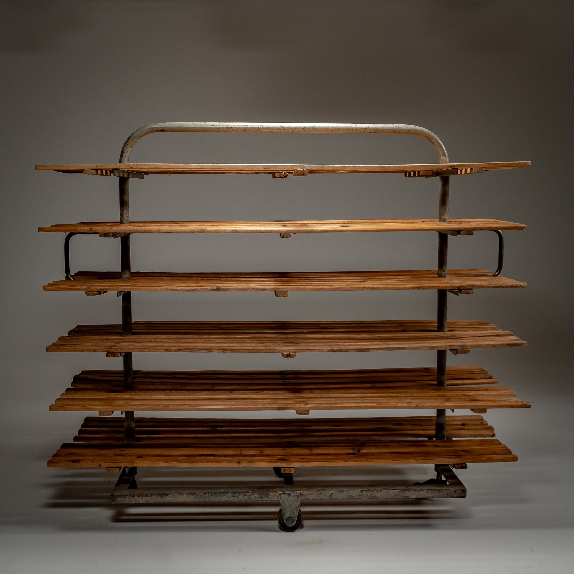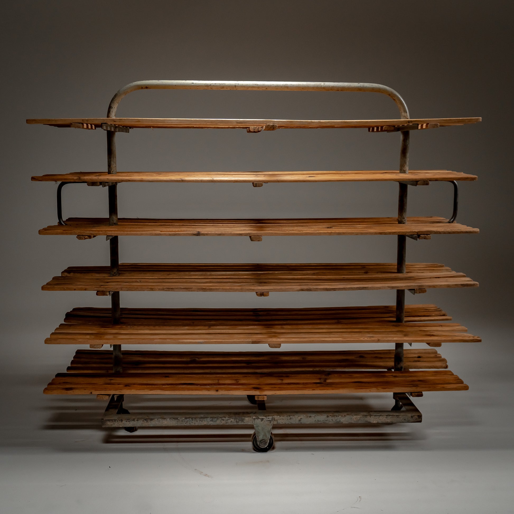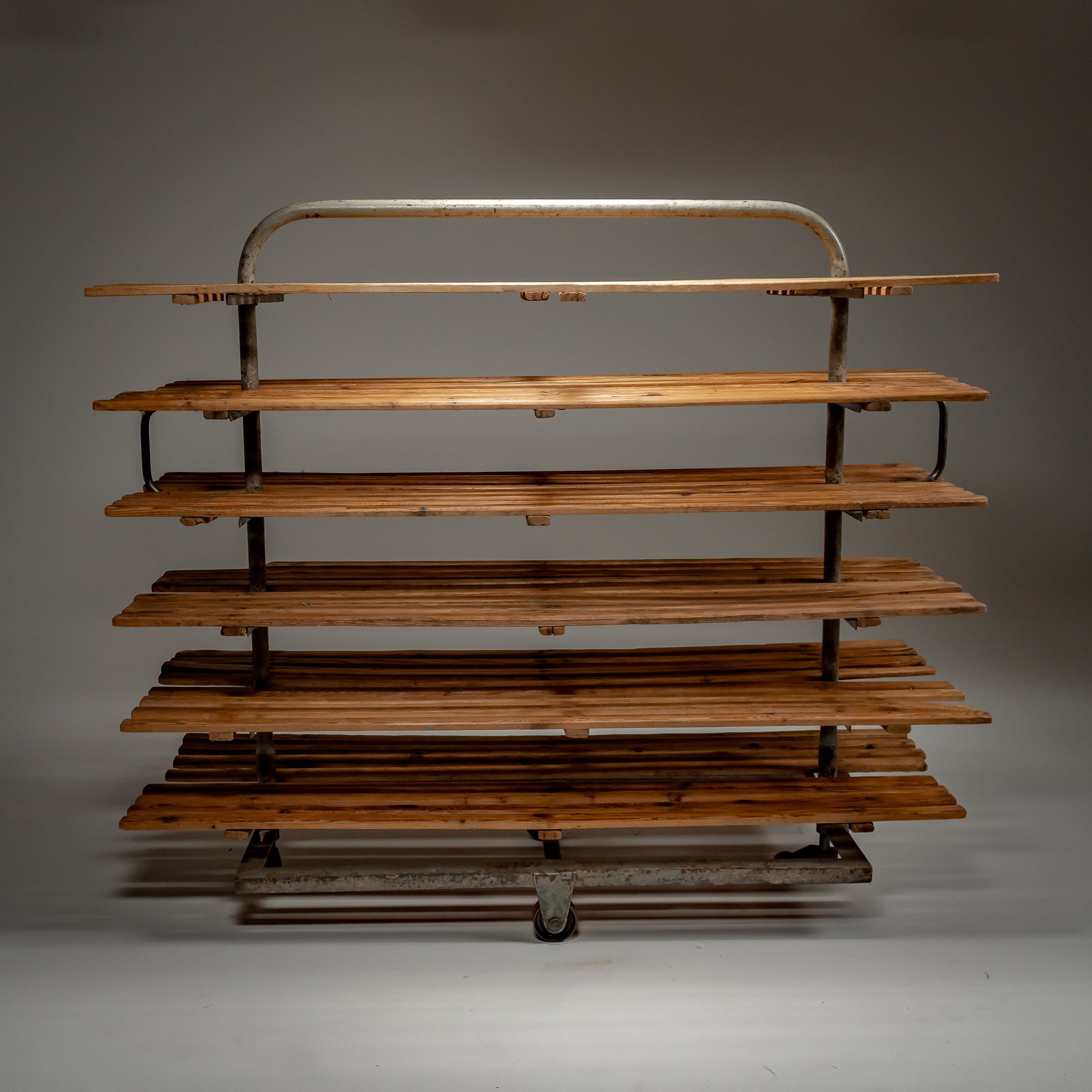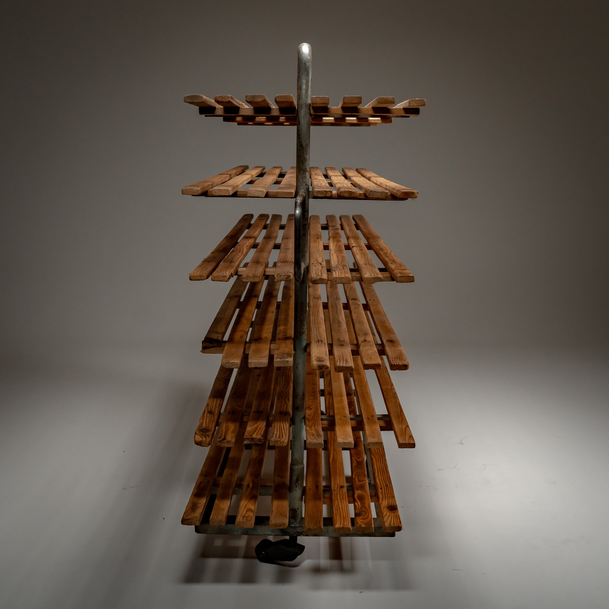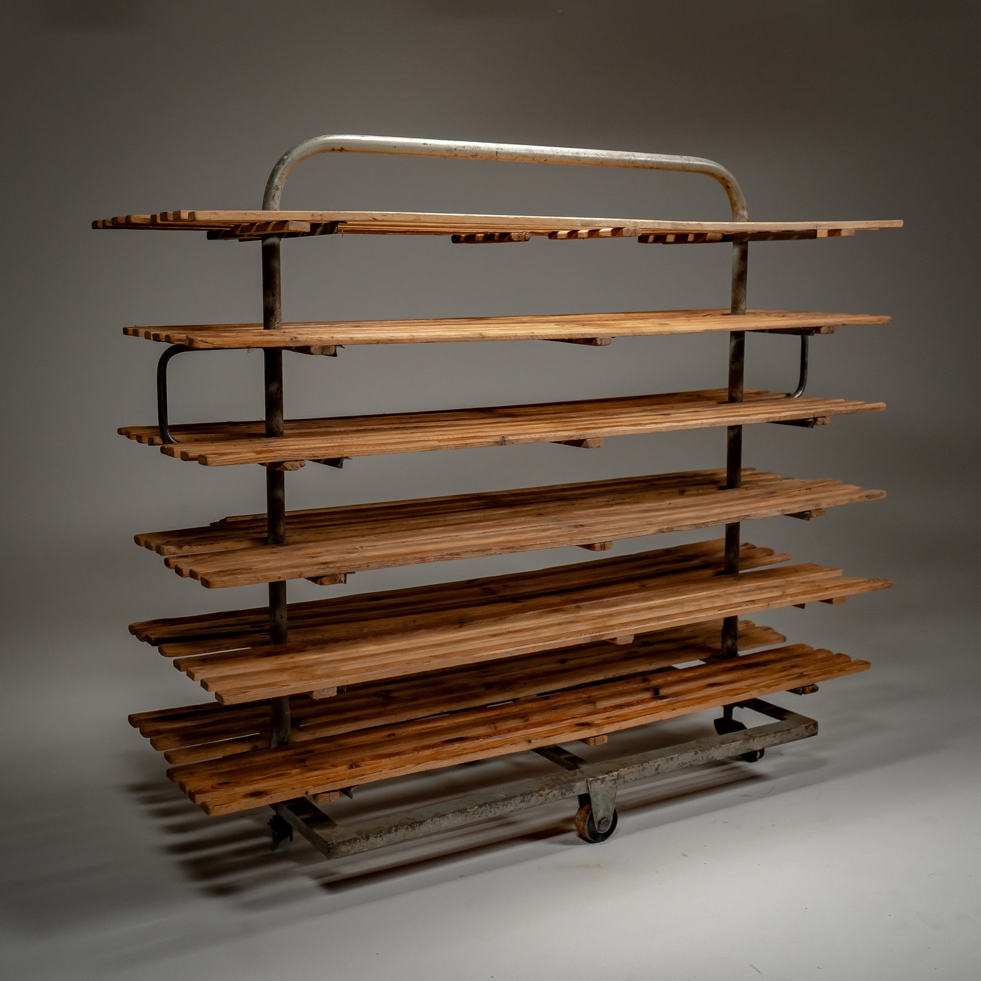 Denne seks-hyllers brødtrallen stammer fra Gdańsk og dateres til rundt 1950. Den ble brukt i lokale bakerier til å transportere ferske bakervarer mellom produksjon og utsalg, og gjenspeiler den funksjonelle effektiviteten i etterkrigstidens industridesign.