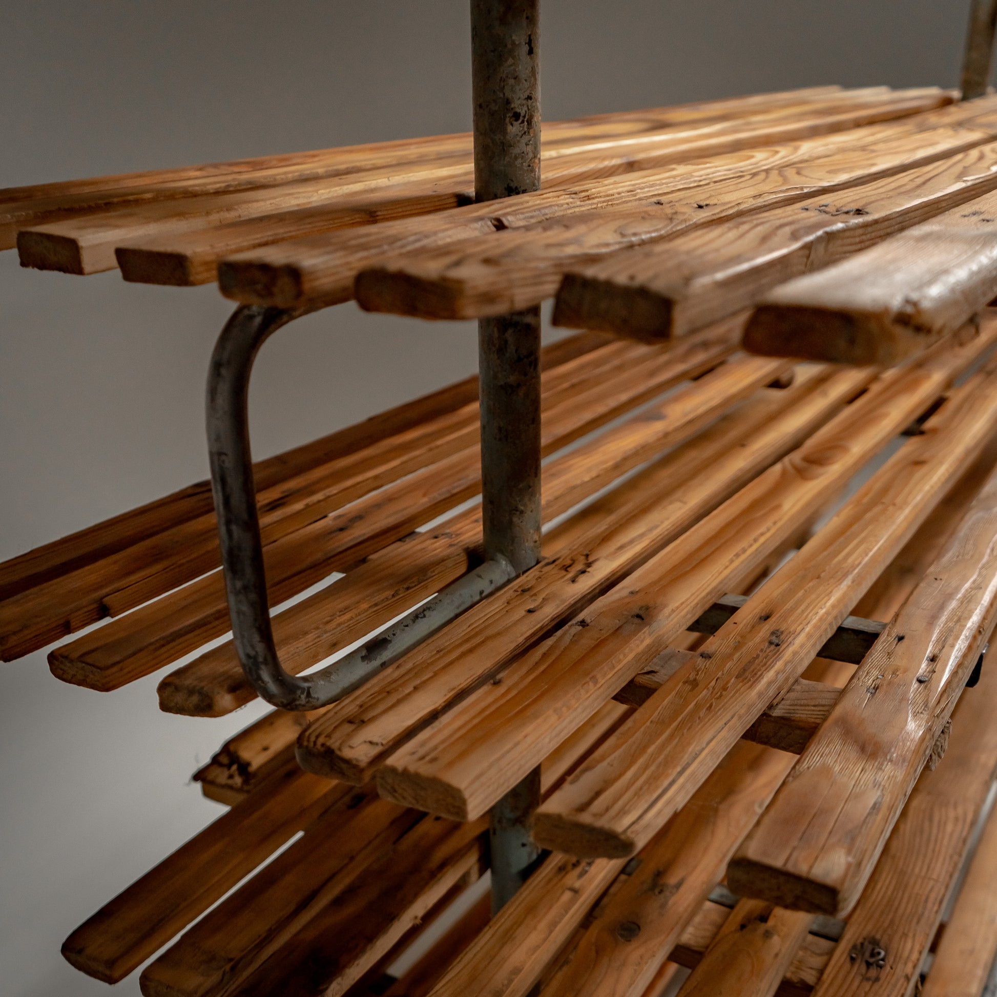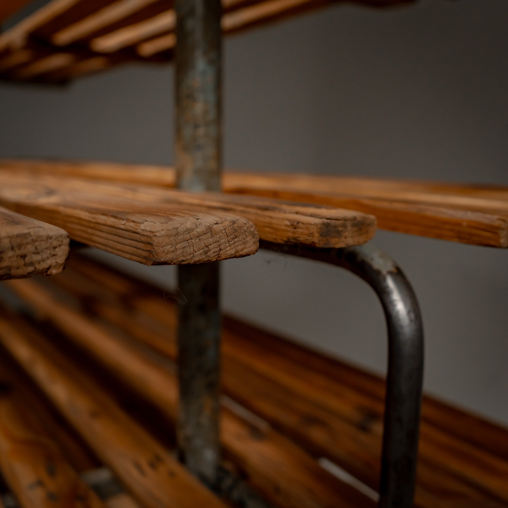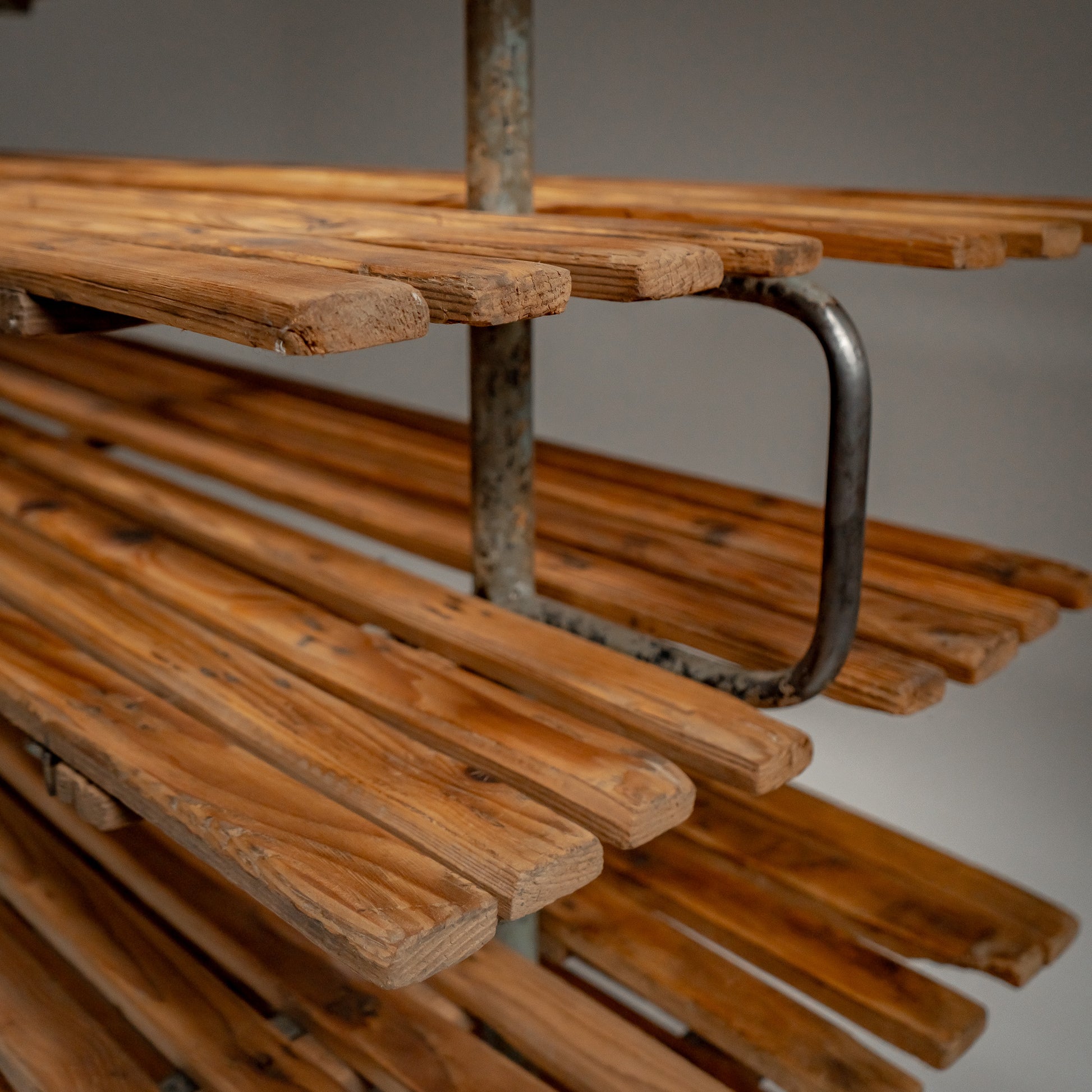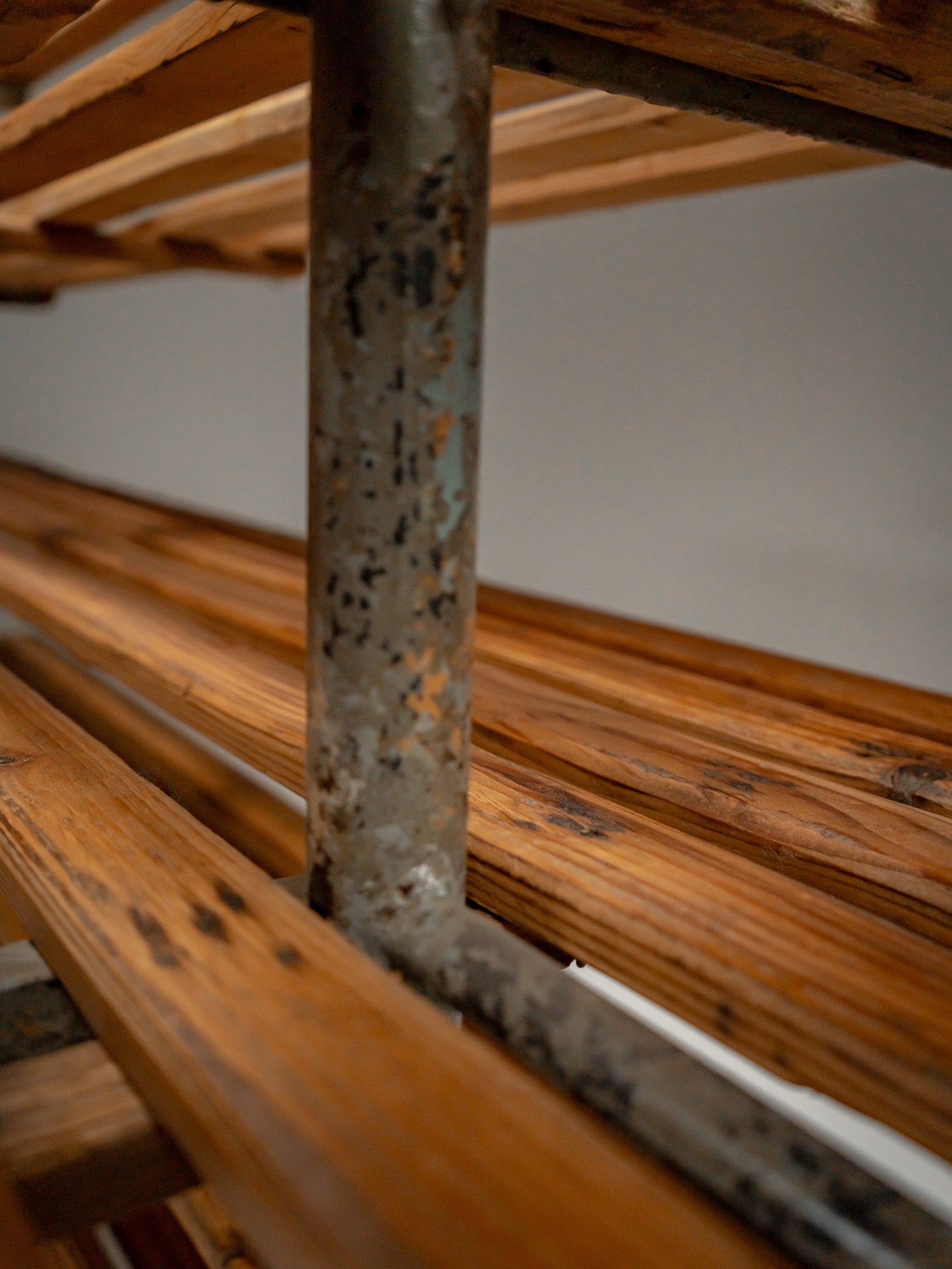 Konstruksjonen består av en stålramme med seks hyller i trespiler, som kombinerer robusthet og letthet. Den lagvise patinaen har olivengrønn som dominerende tone og er formet gjennom flere tiår med daglig bruk.
