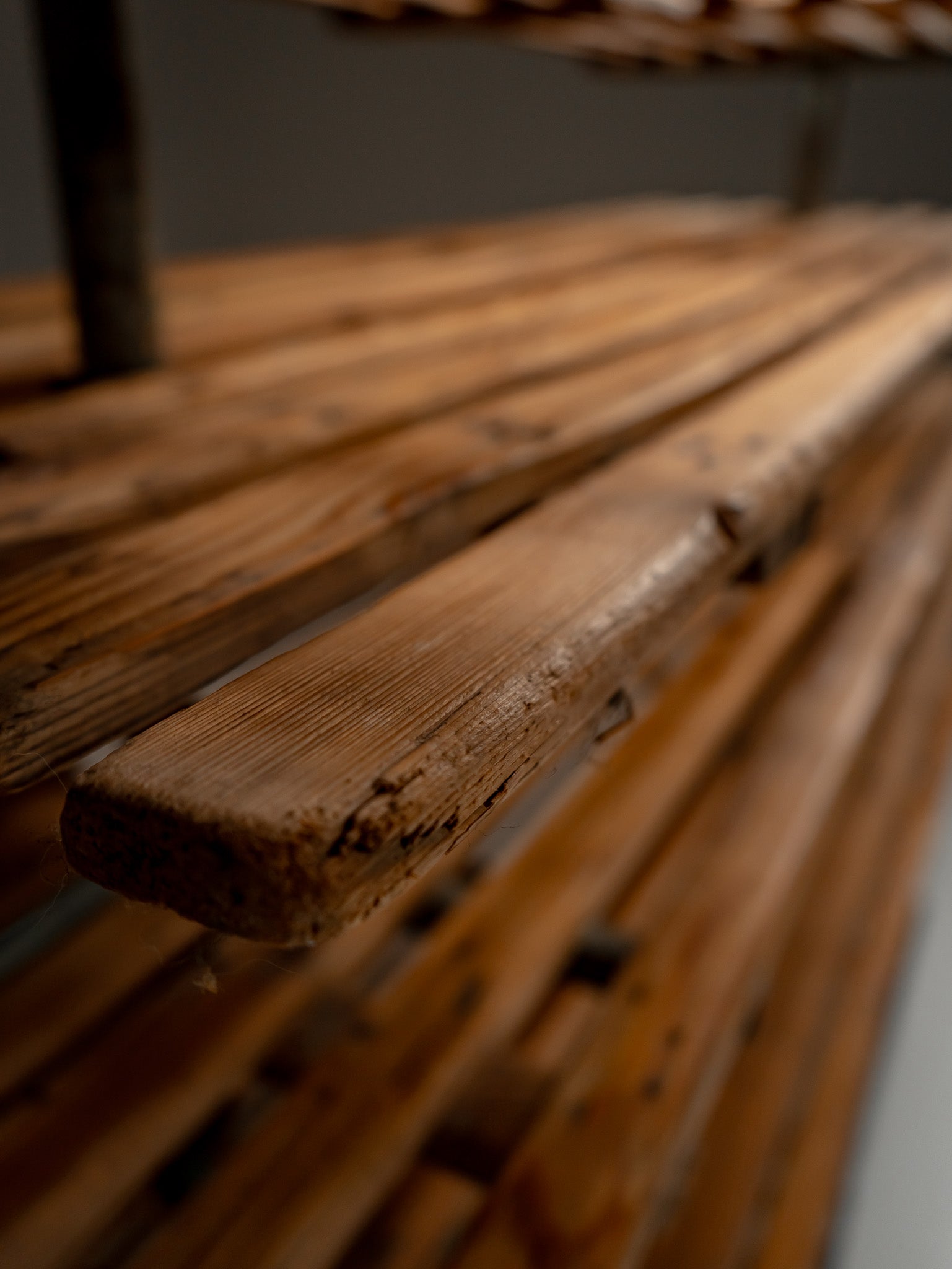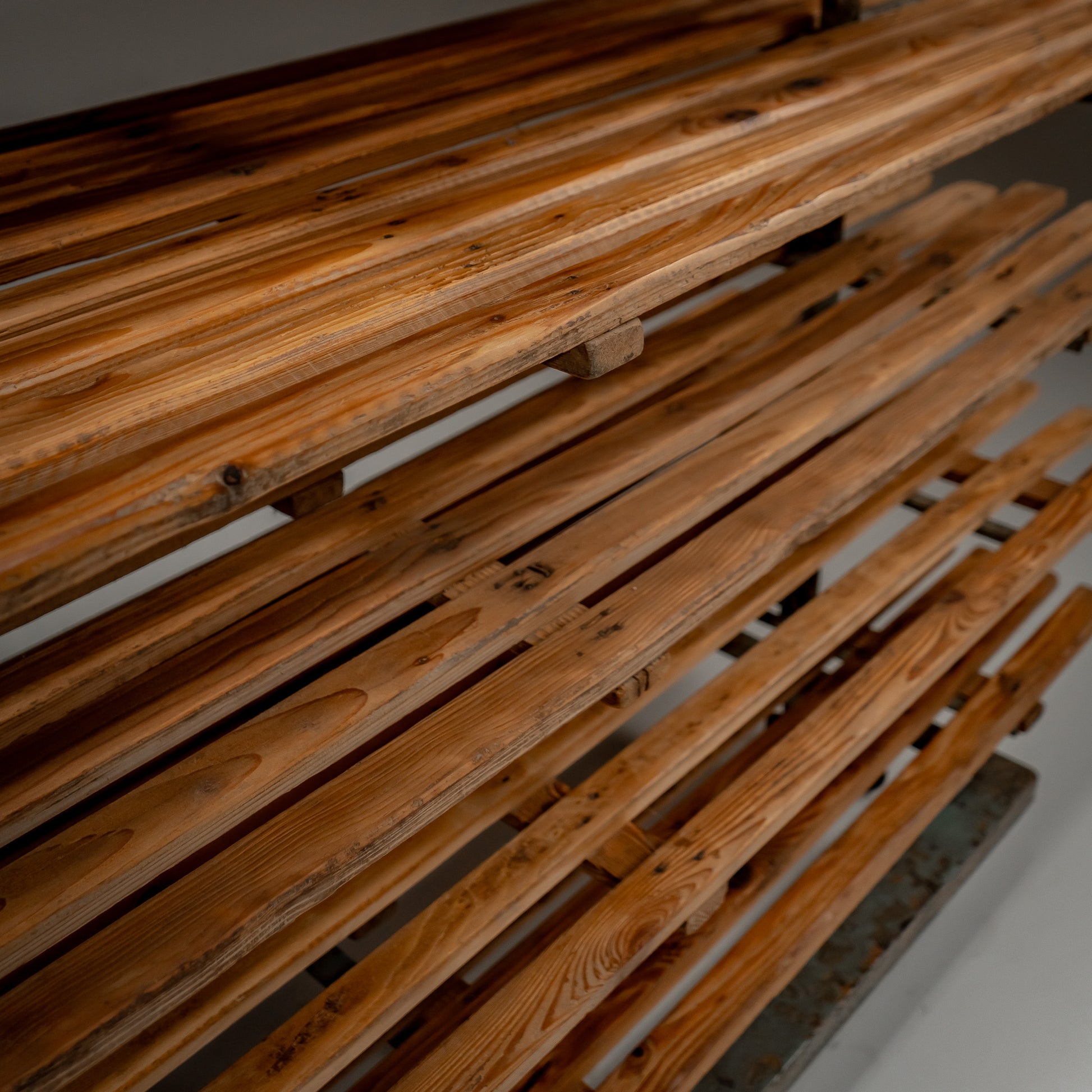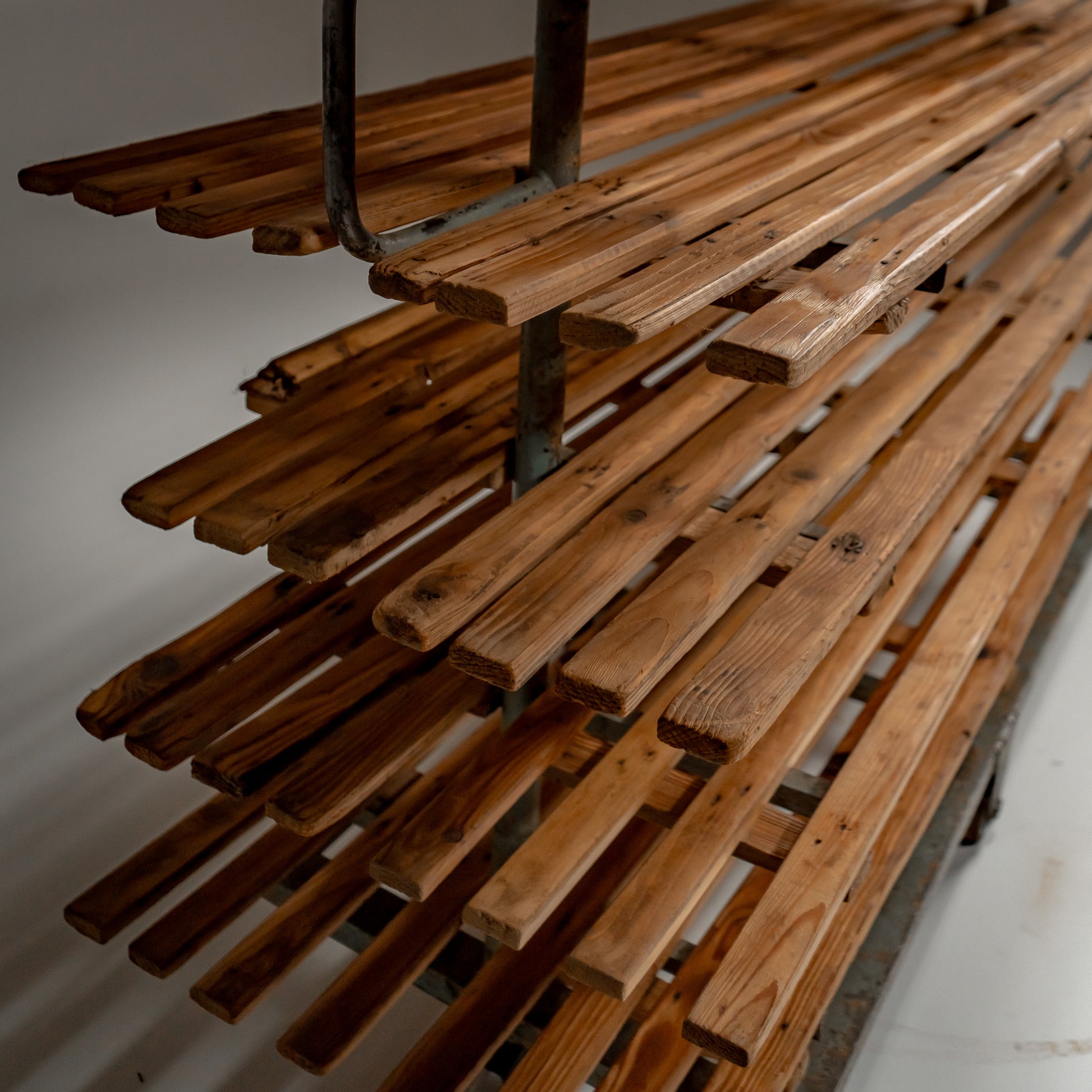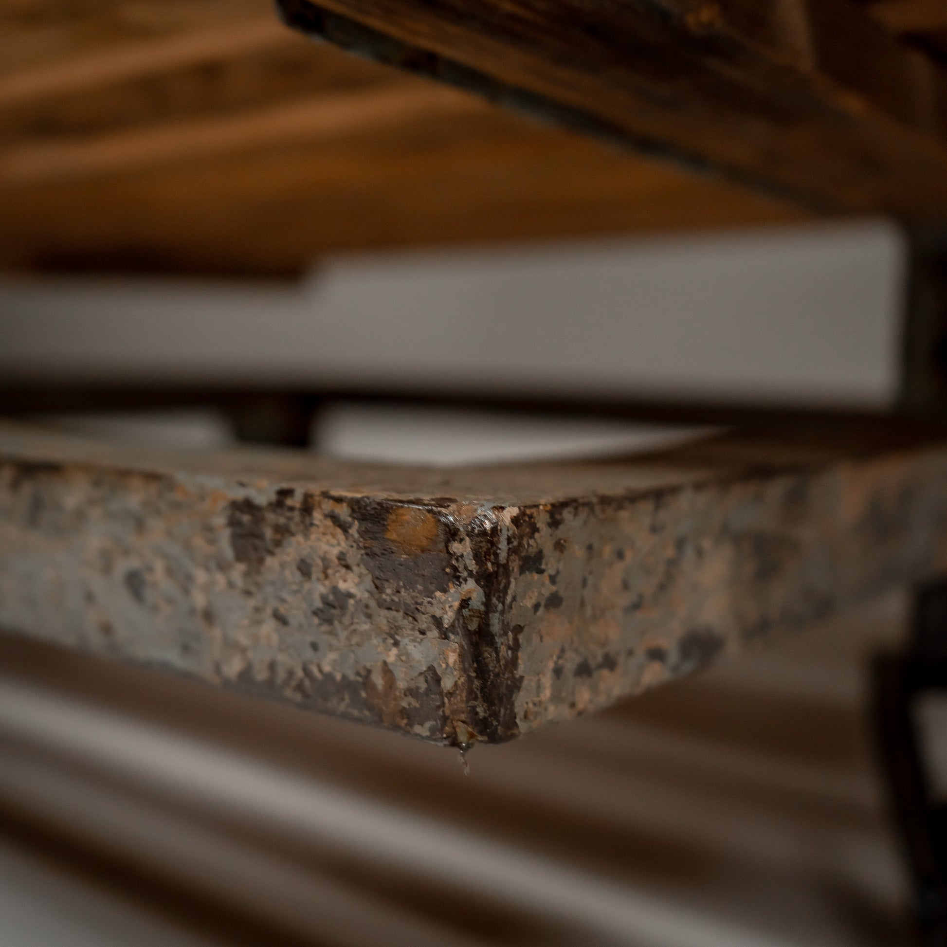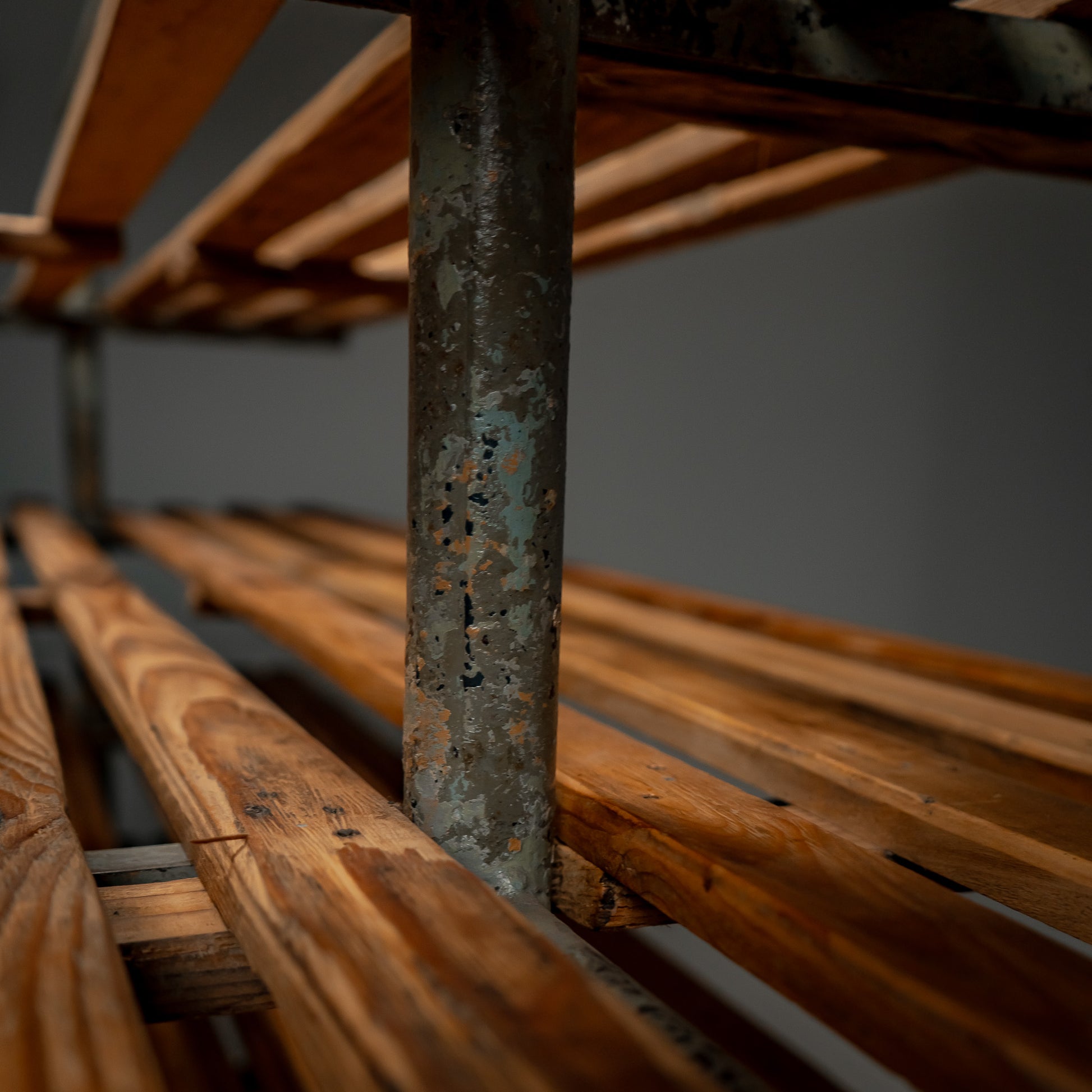 Konstruksjonen består av en stålramme med seks hyller i trespiler, som kombinerer robusthet og letthet. Den lagvise patinaen har olivengrønn som dominerende tone og er formet gjennom flere tiår med daglig bruk.