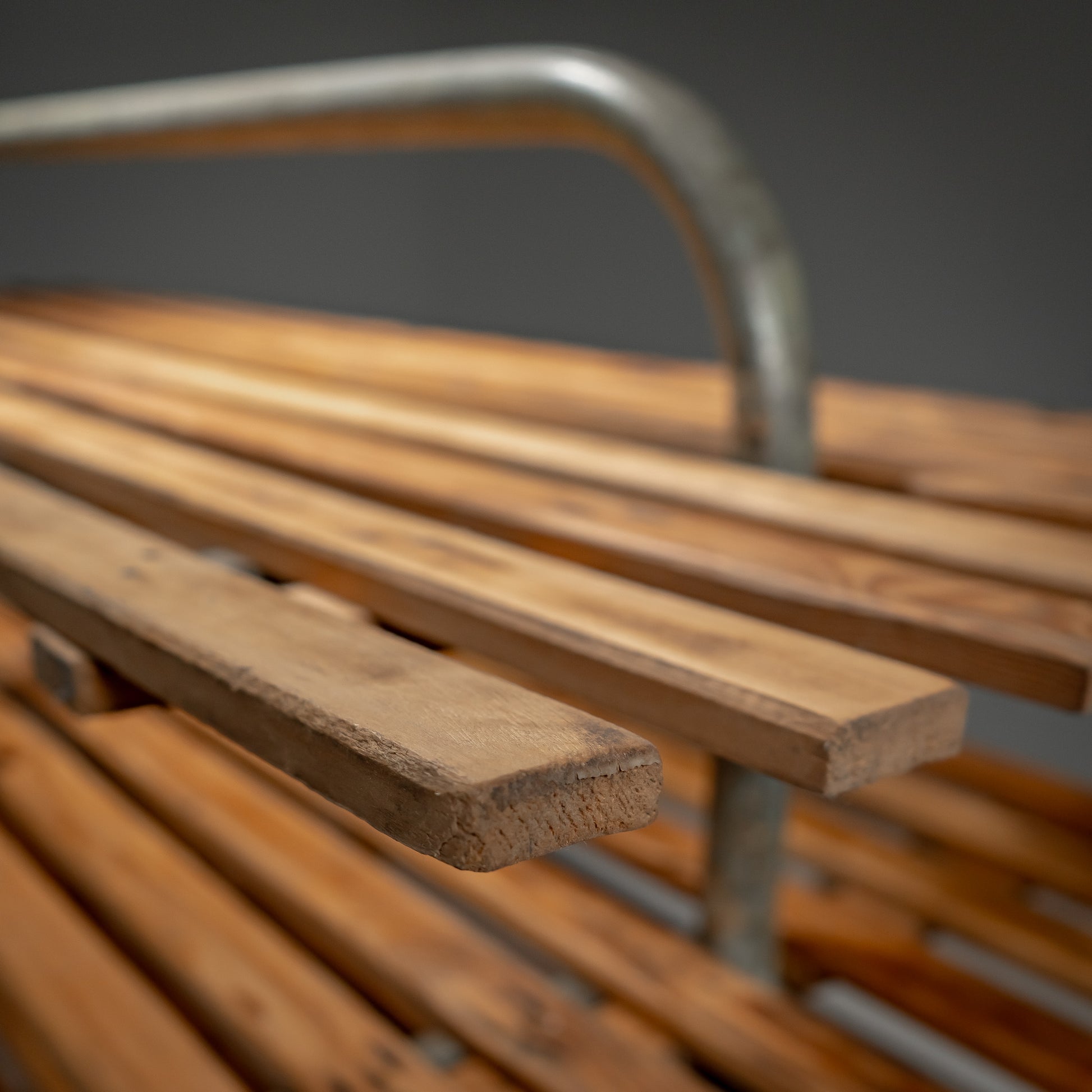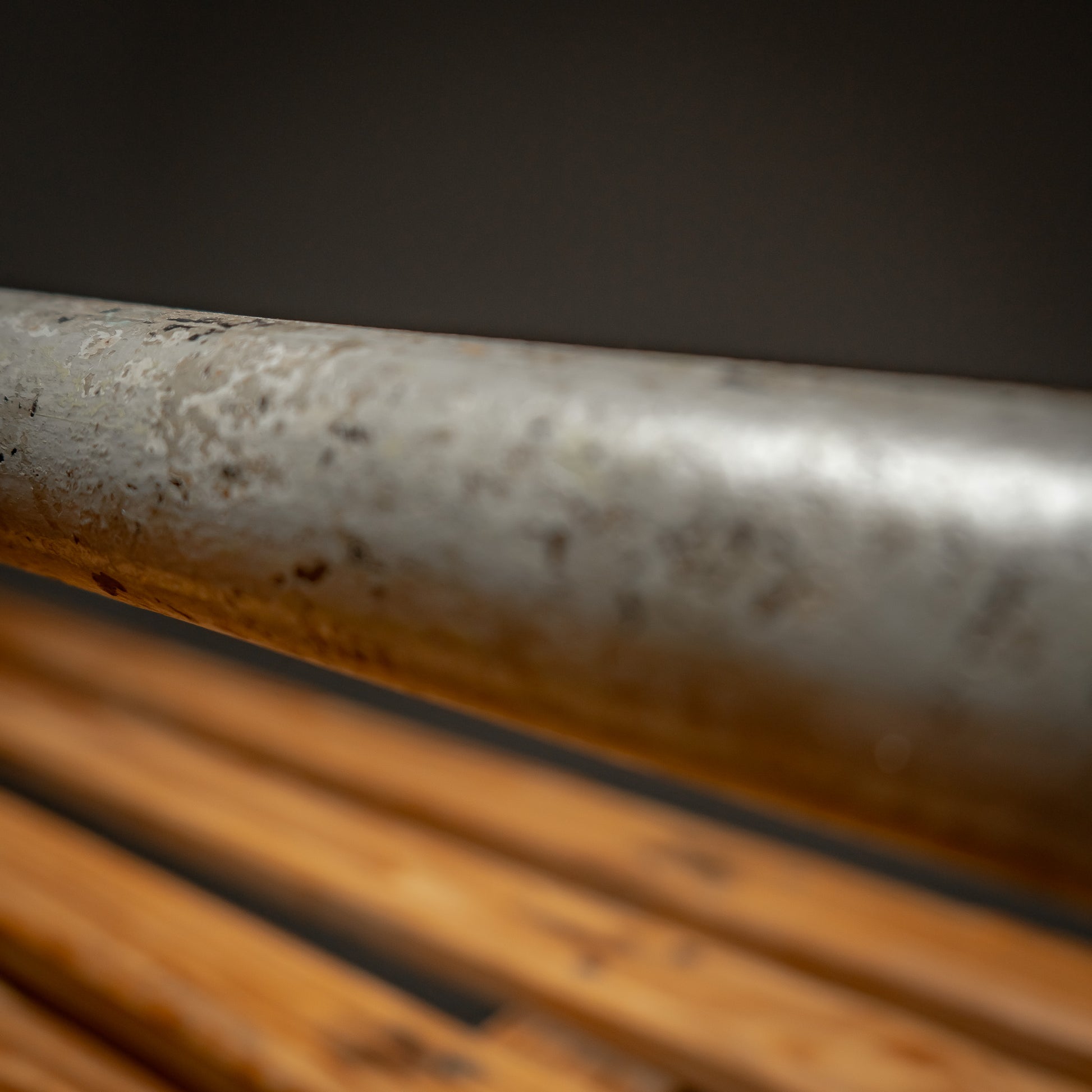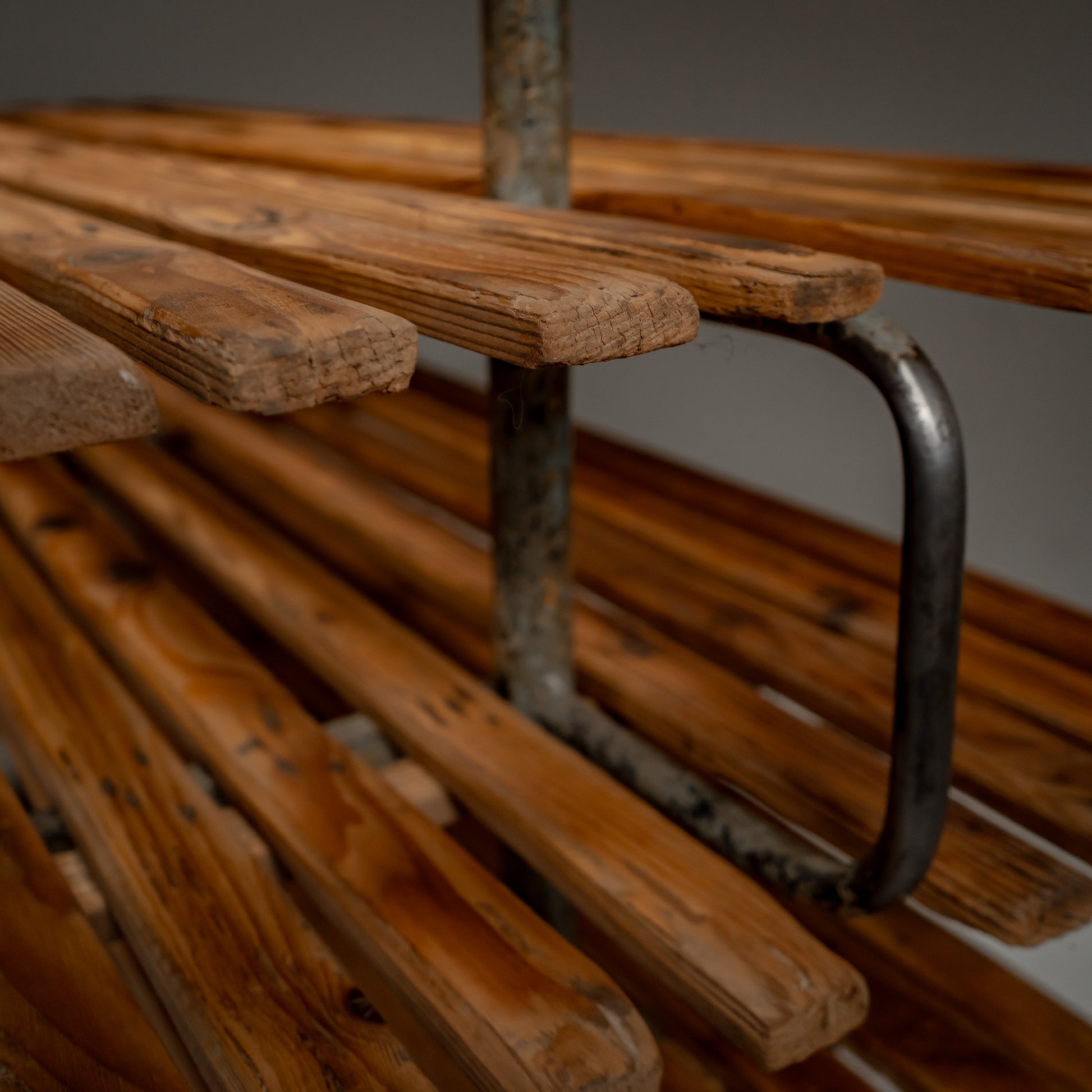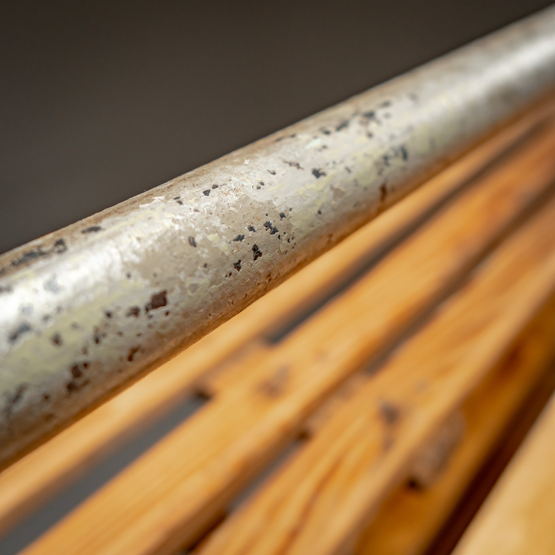 Konstruksjonen består av en stålramme med seks hyller i trespiler, som kombinerer robusthet og letthet. Den lagvise patinaen har olivengrønn som dominerende tone og er formet gjennom flere tiår med daglig bruk.