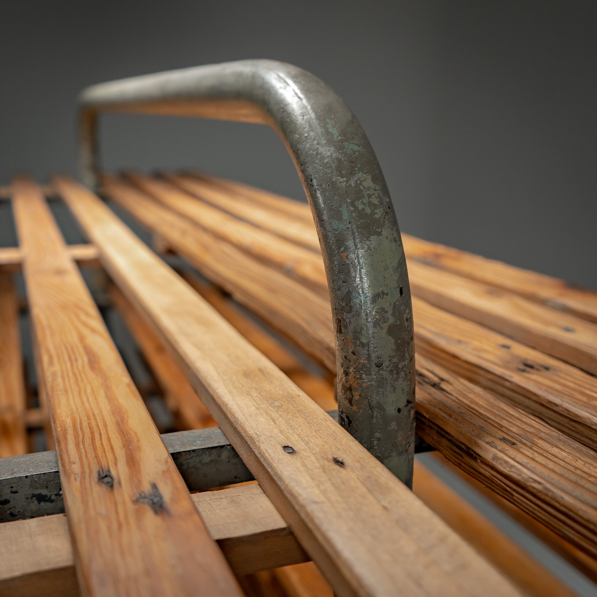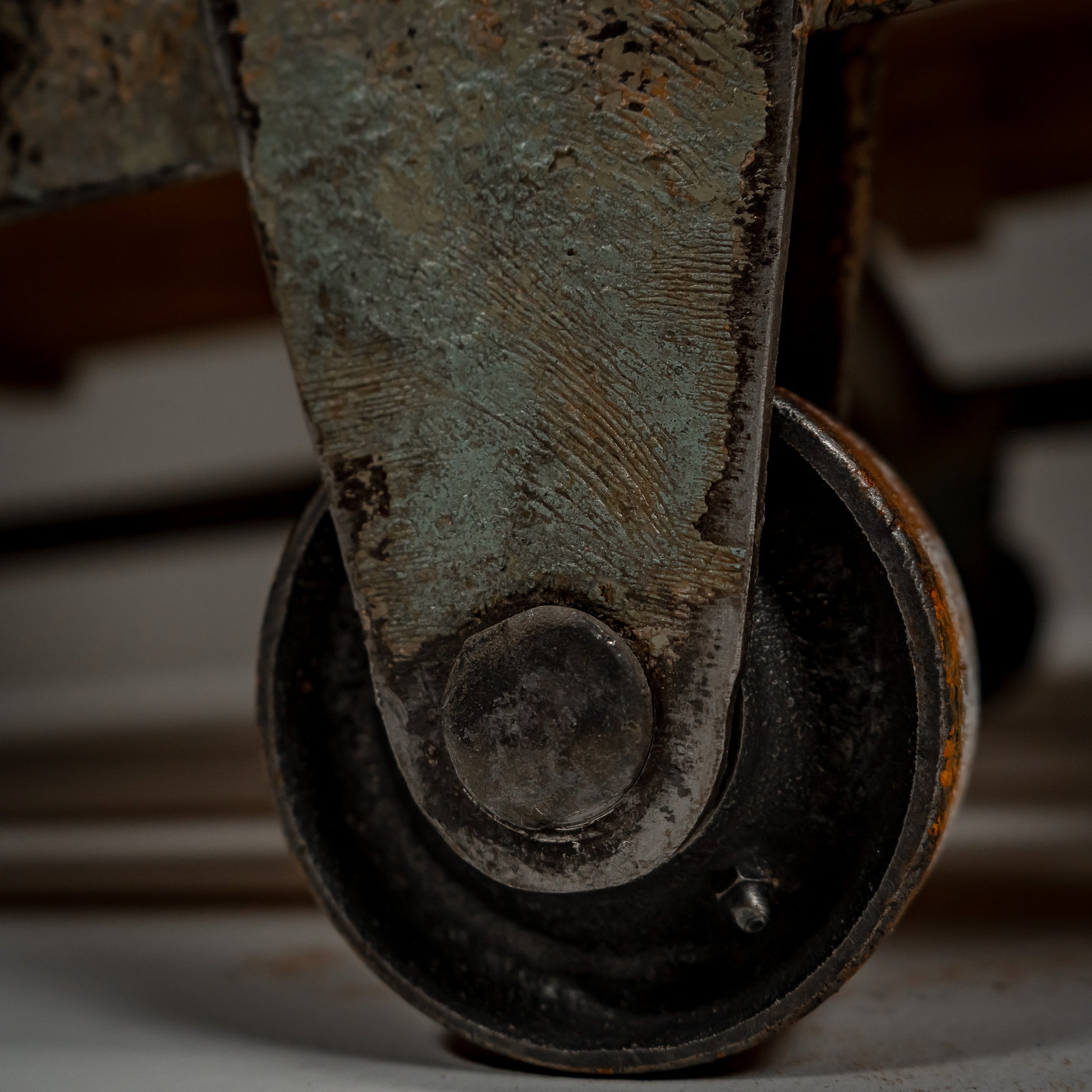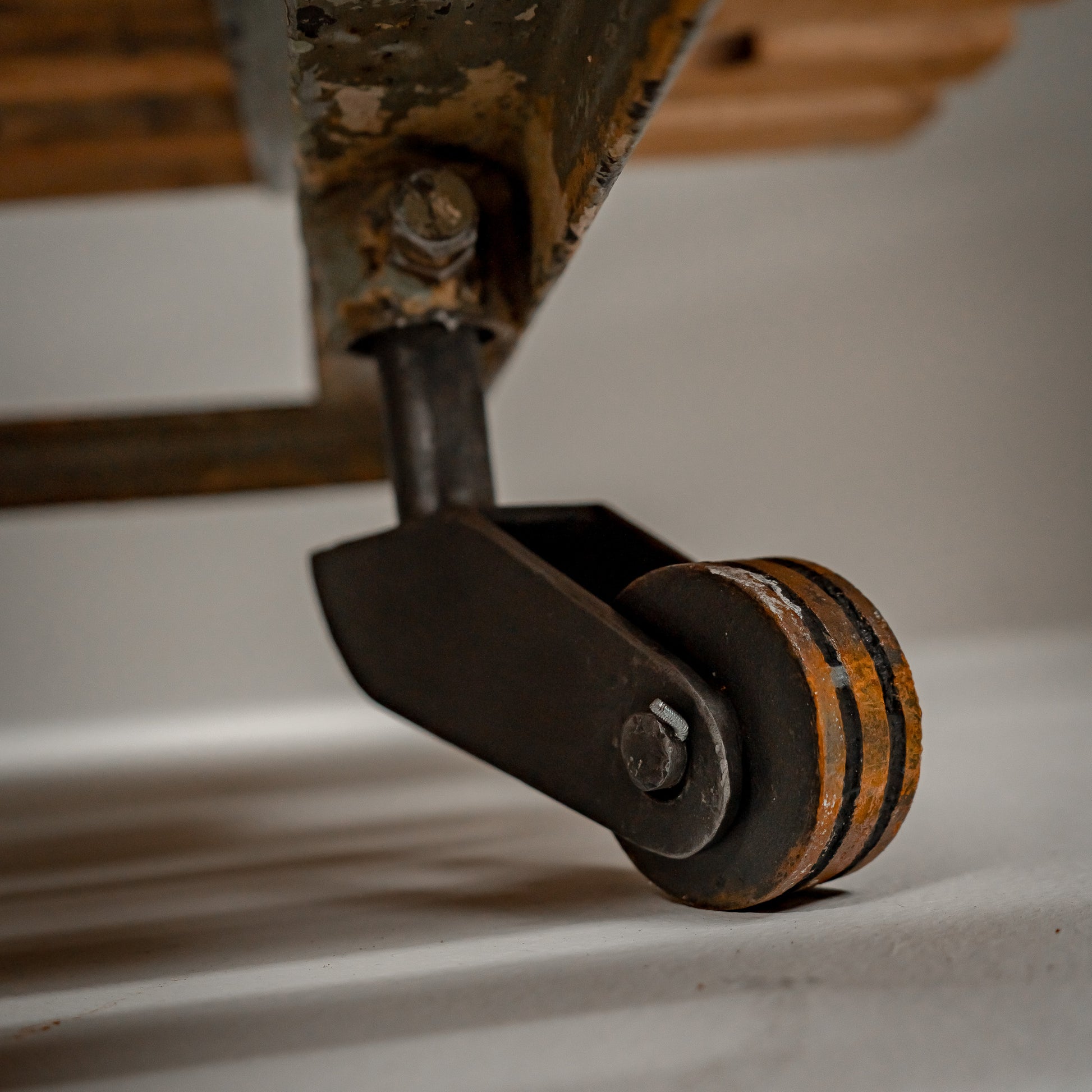 Et ekte arbeidsobjekt fra etterkrigstidens Gdańsk, som i dag fungerer som hylle, display eller mobil oppbevaring i et moderne interiør.