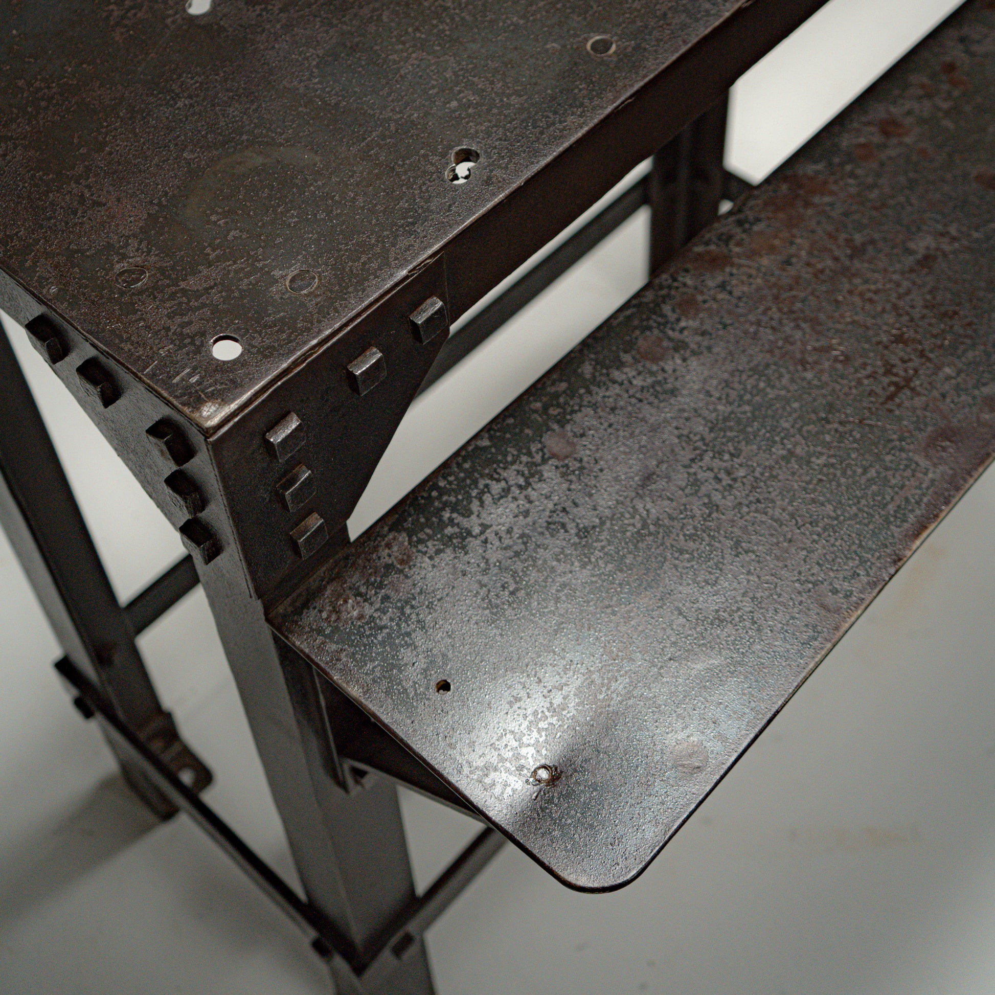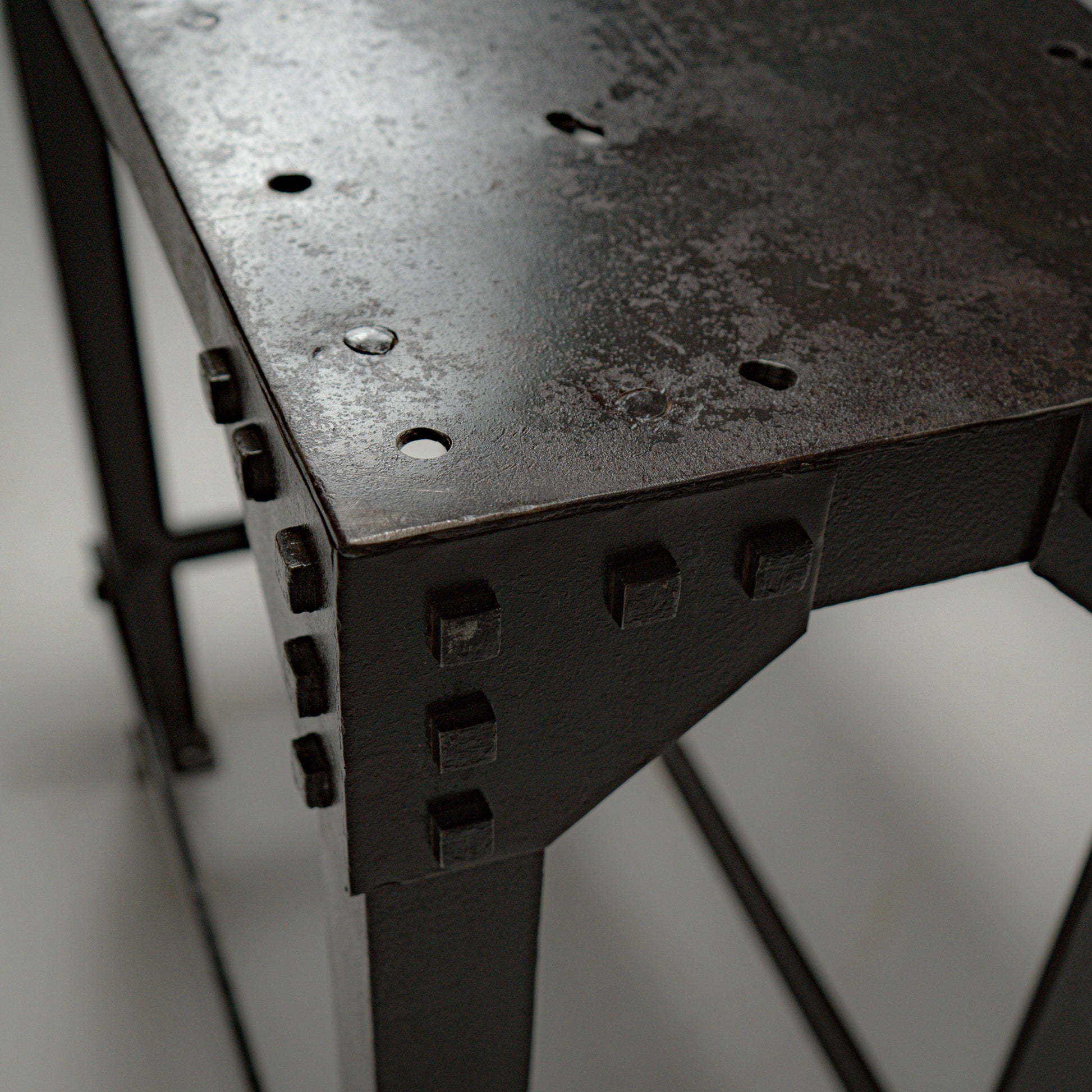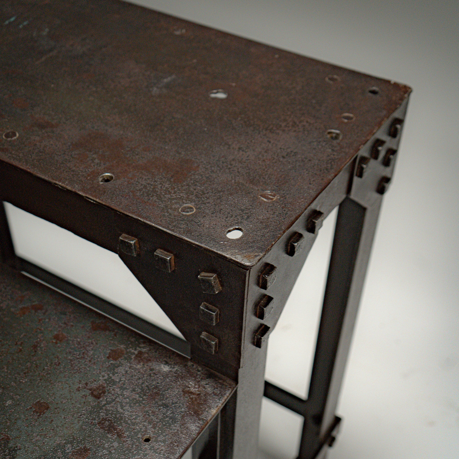 Hele strukturen er bygget i kraftig stål og forsterket med synlige naglede hjørneplater. Naglene er ikke dekorative, men bærende elementer som tydelig viser konstruksjonslogikken. Kvadratiske stålben og tverravstivning gir stabilitet, mens den integrerte nedre hyllen tilfører både funksjon og balanse i uttrykket.