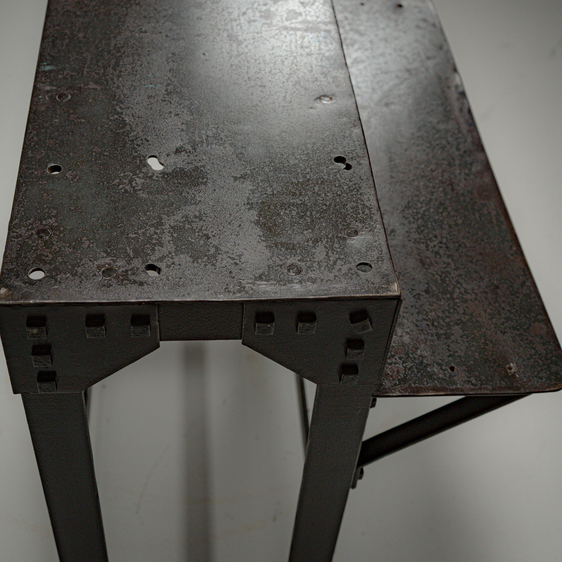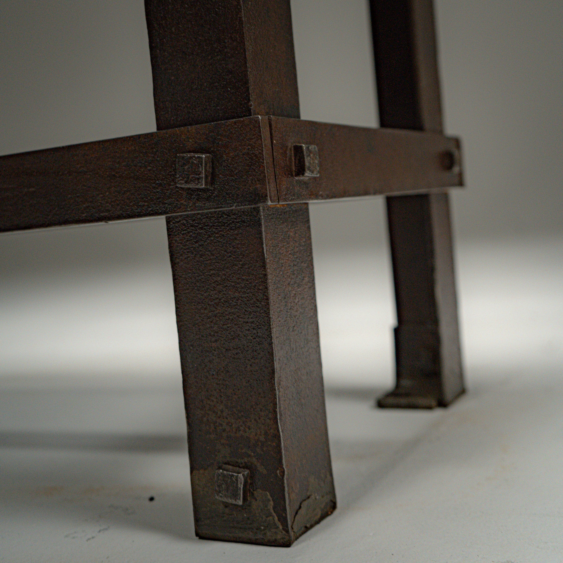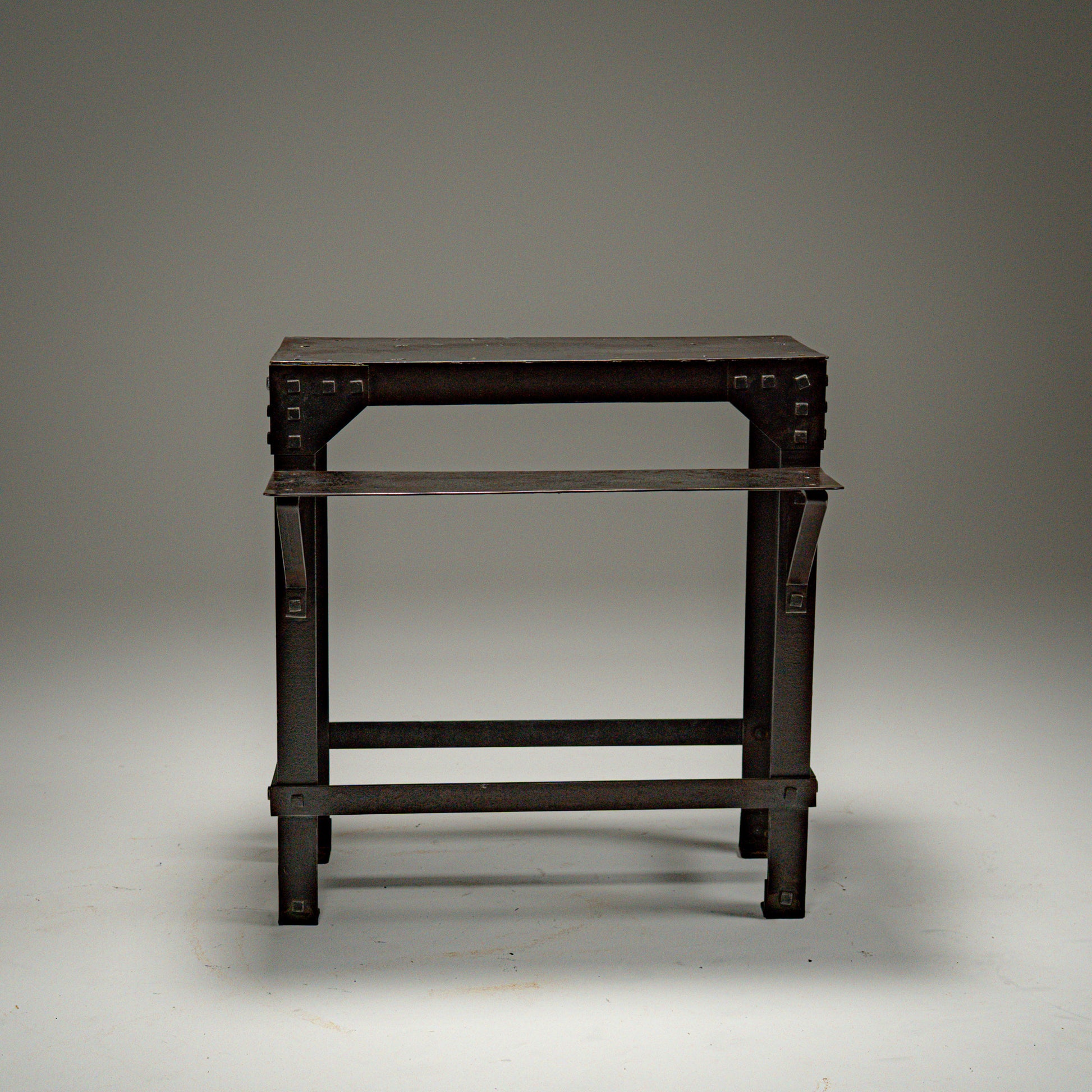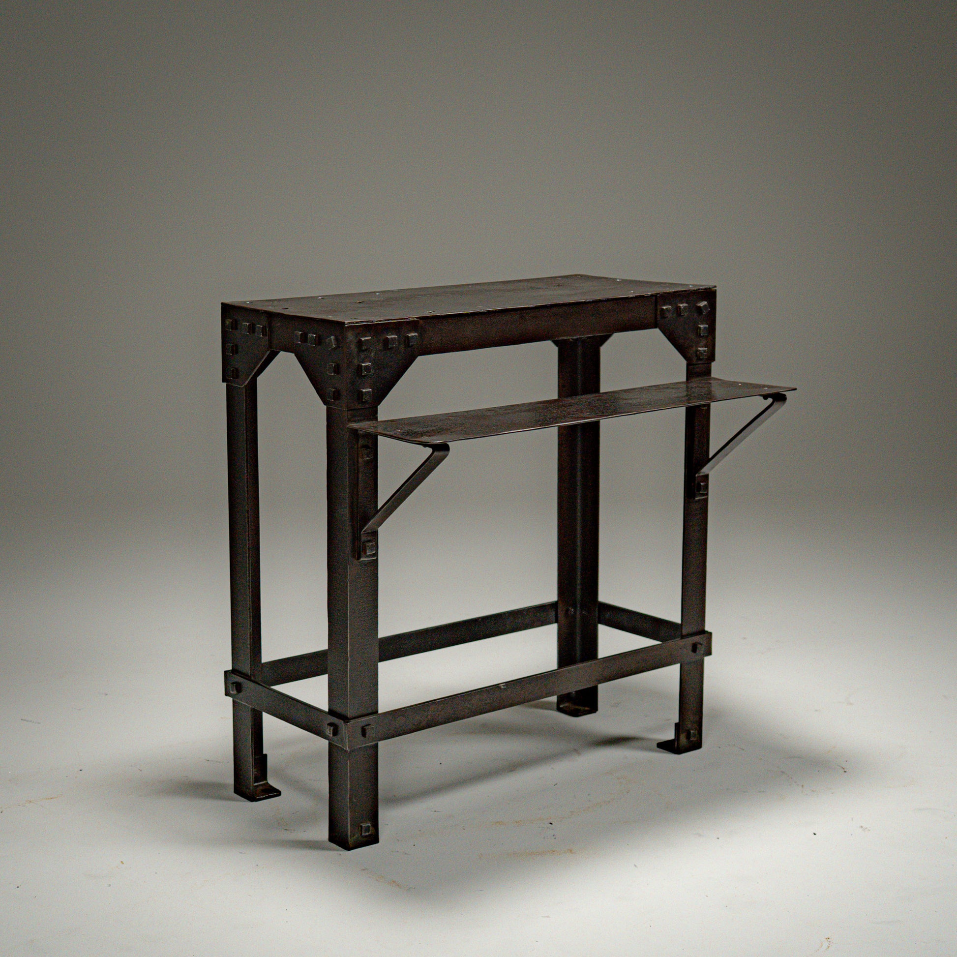 Hele strukturen er bygget i kraftig stål og forsterket med synlige naglede hjørneplater. Naglene er ikke dekorative, men bærende elementer som tydelig viser konstruksjonslogikken. Kvadratiske stålben og tverravstivning gir stabilitet, mens den integrerte nedre hyllen tilfører både funksjon og balanse i uttrykket.