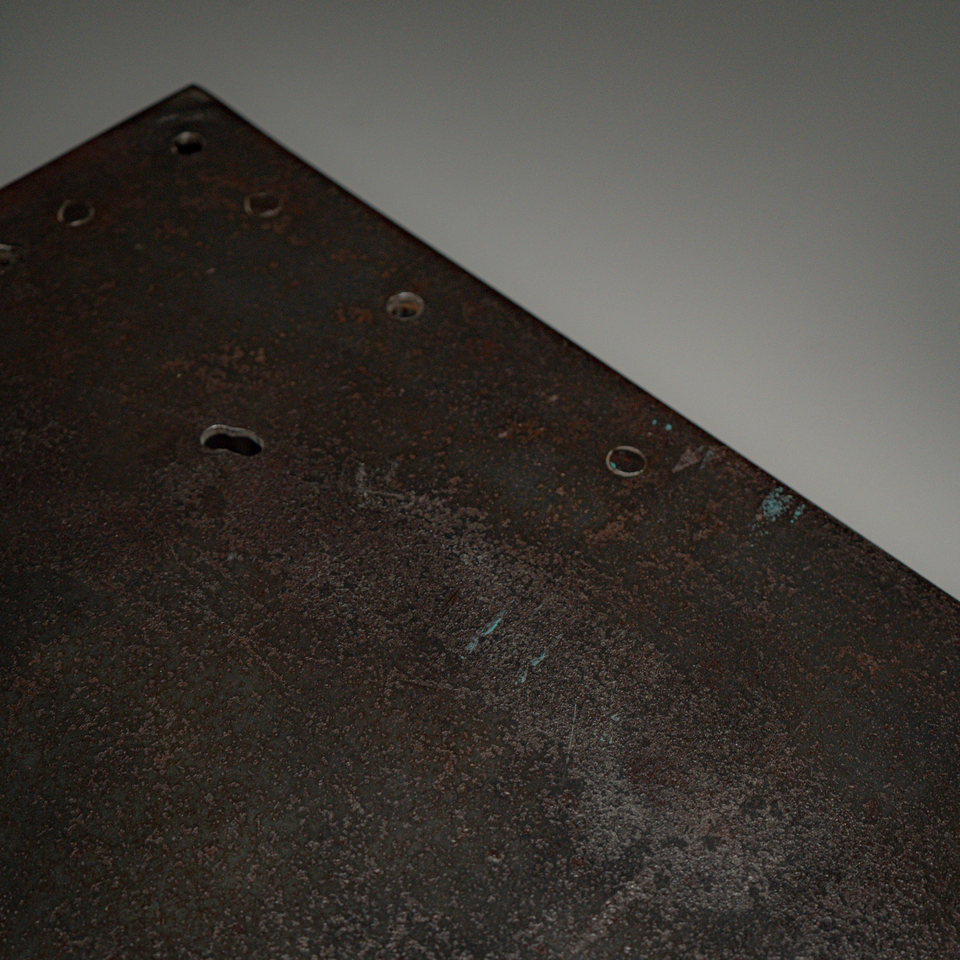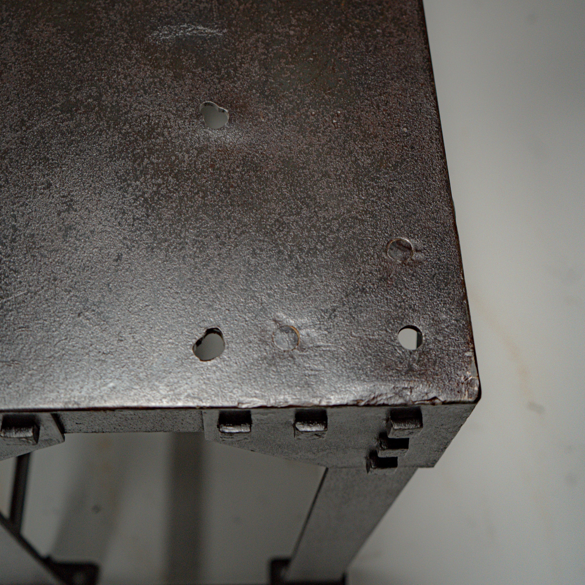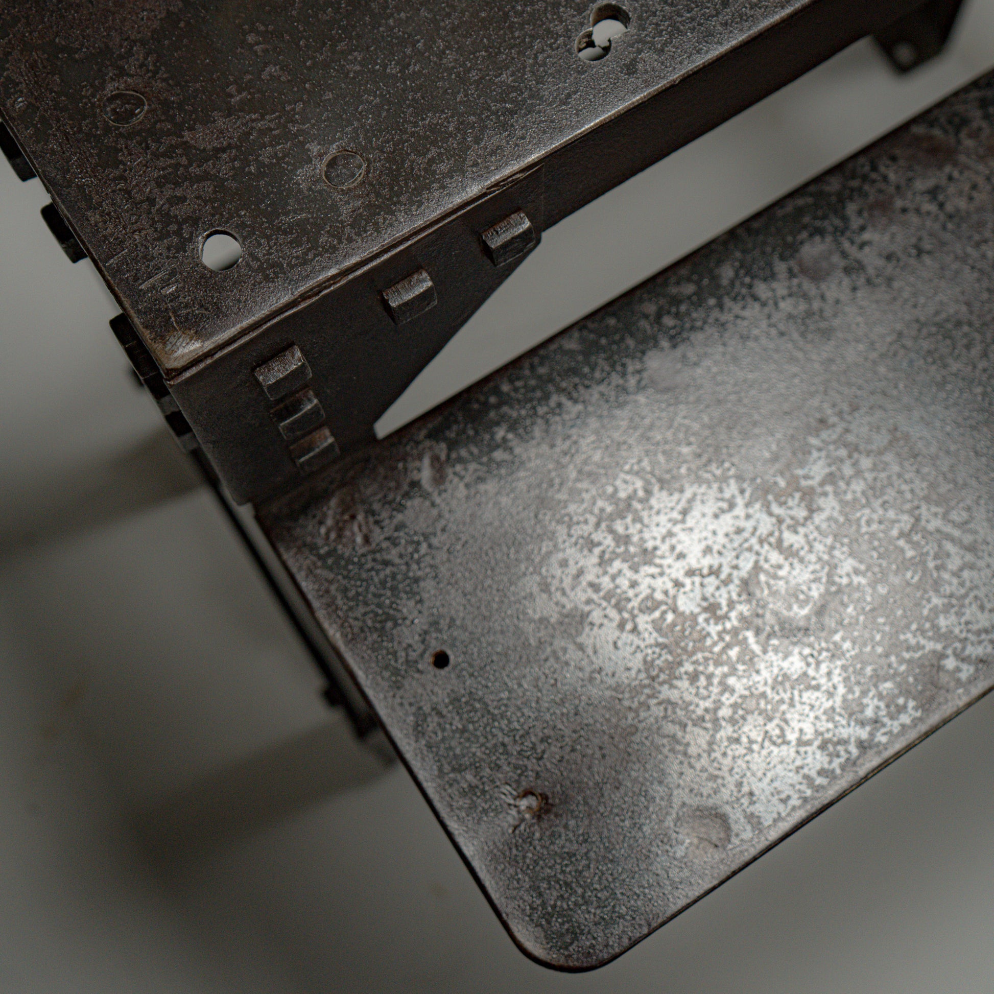 Overflaten har bevart sin mørke industrielle patina. Metallet er renset og beskyttet, samtidig som den rå karakteren og sporene etter fabrikkbruk er bevart.