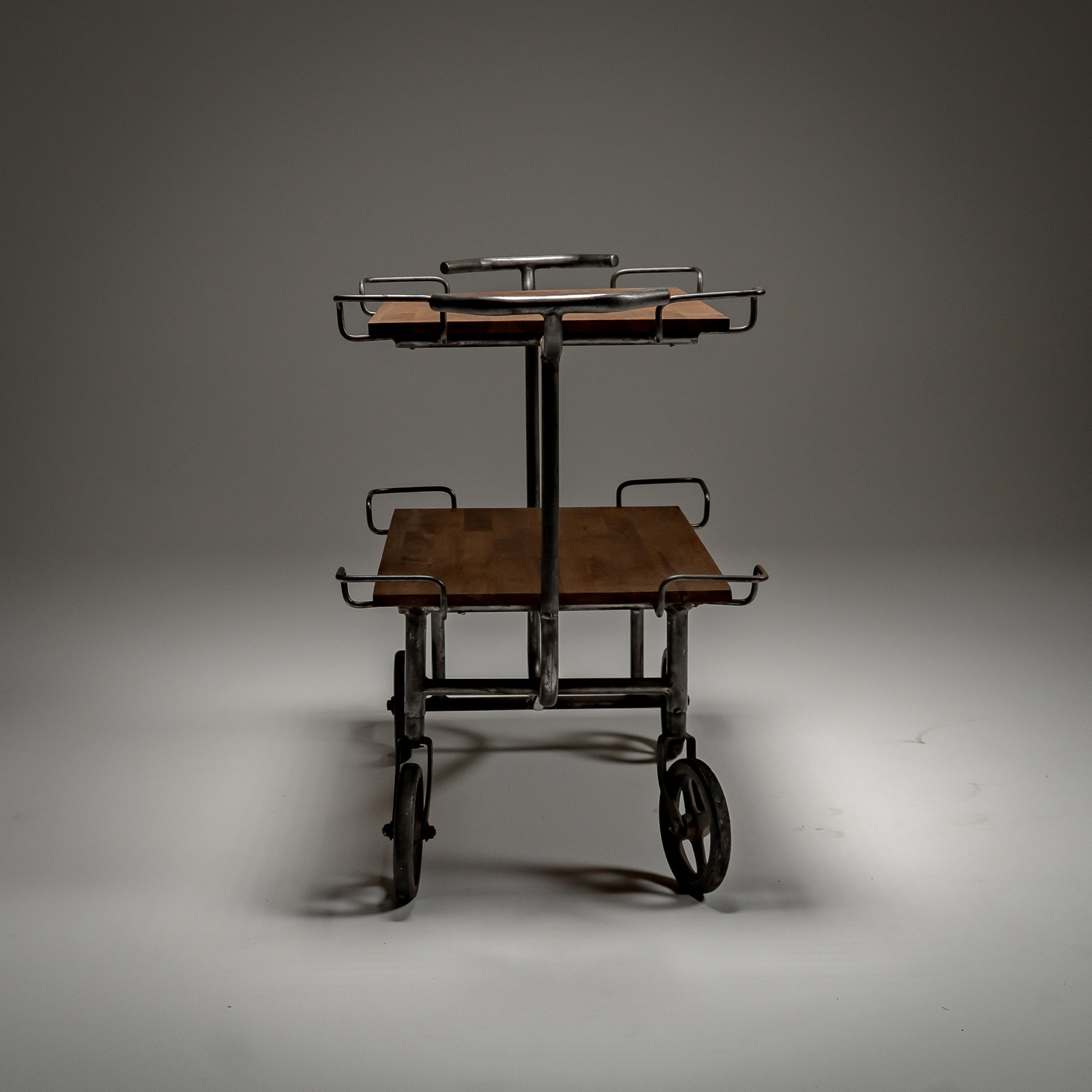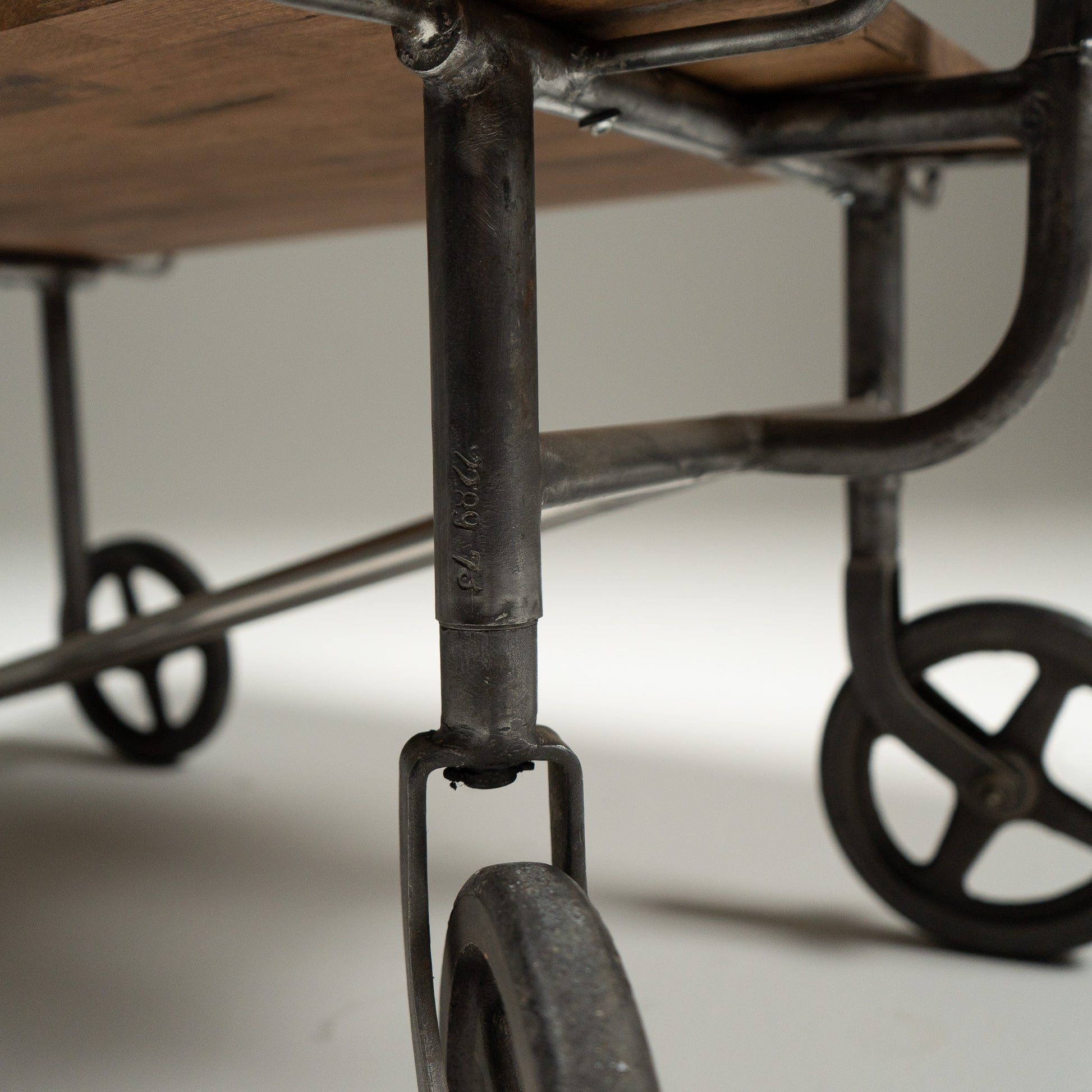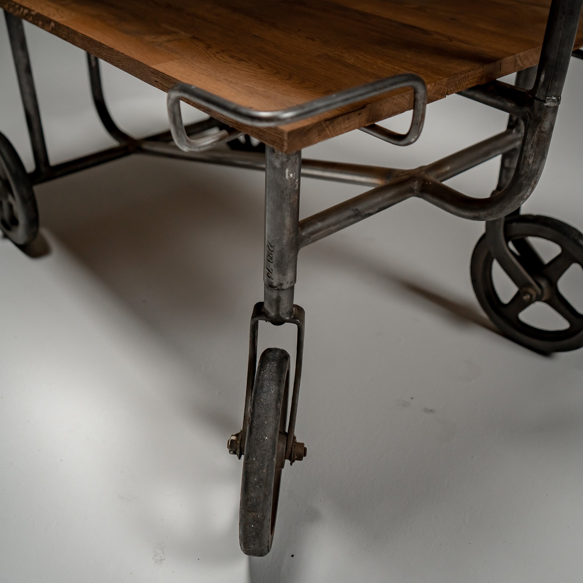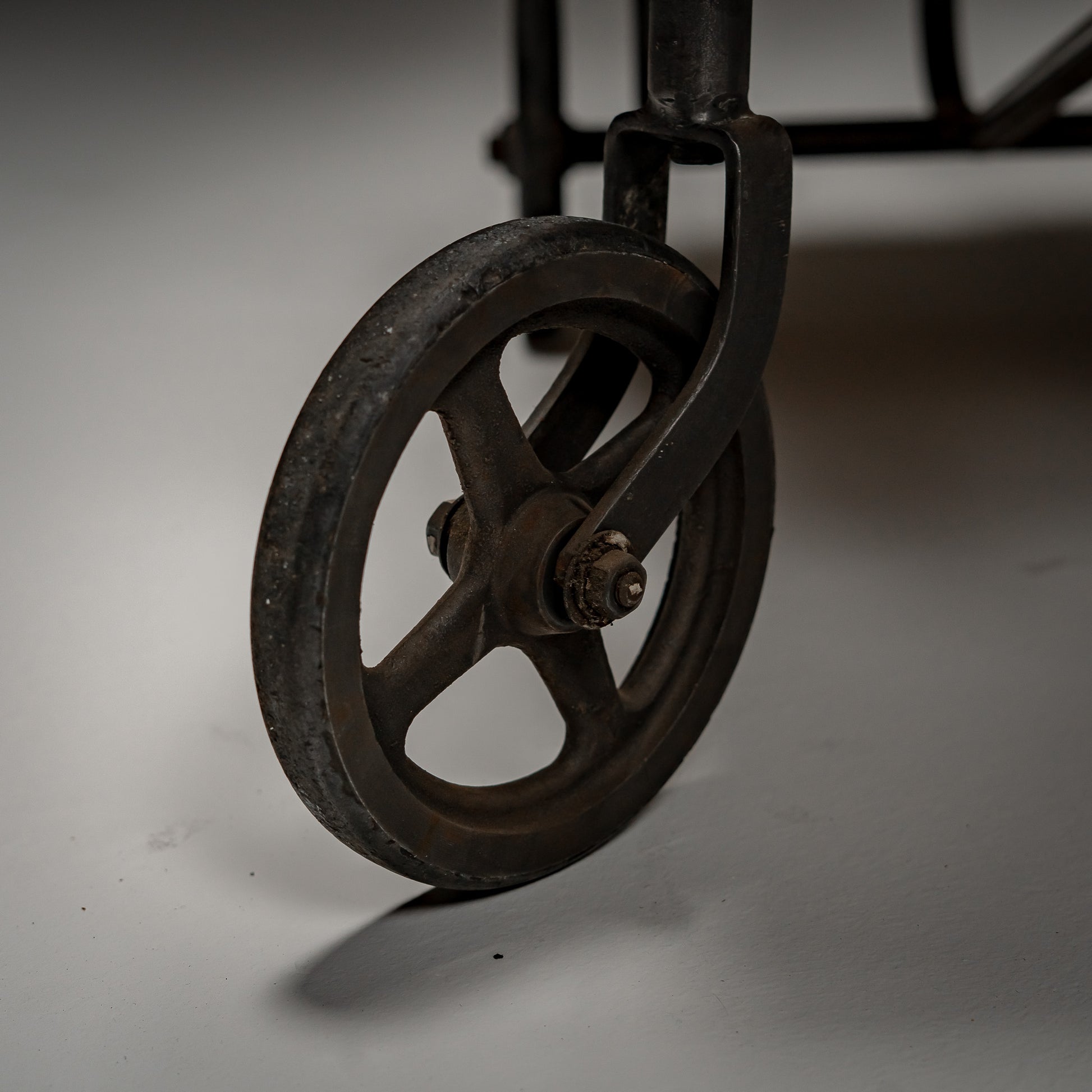 Stålrammen hviler på solide støpejernshjul, utviklet for stabilitet og jevn bevegelse over harde gulv. Proporsjonene er stramme og mekaniske. Hver sveis og hvert buede håndtak gjenspeiler medisinsk ingeniørkunst fra midten av det 20. århundre, der funksjon alltid gikk foran estetikk.