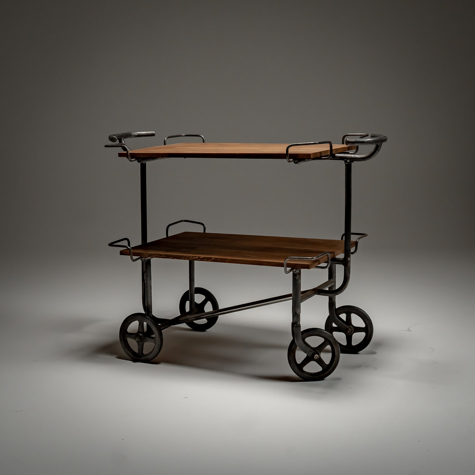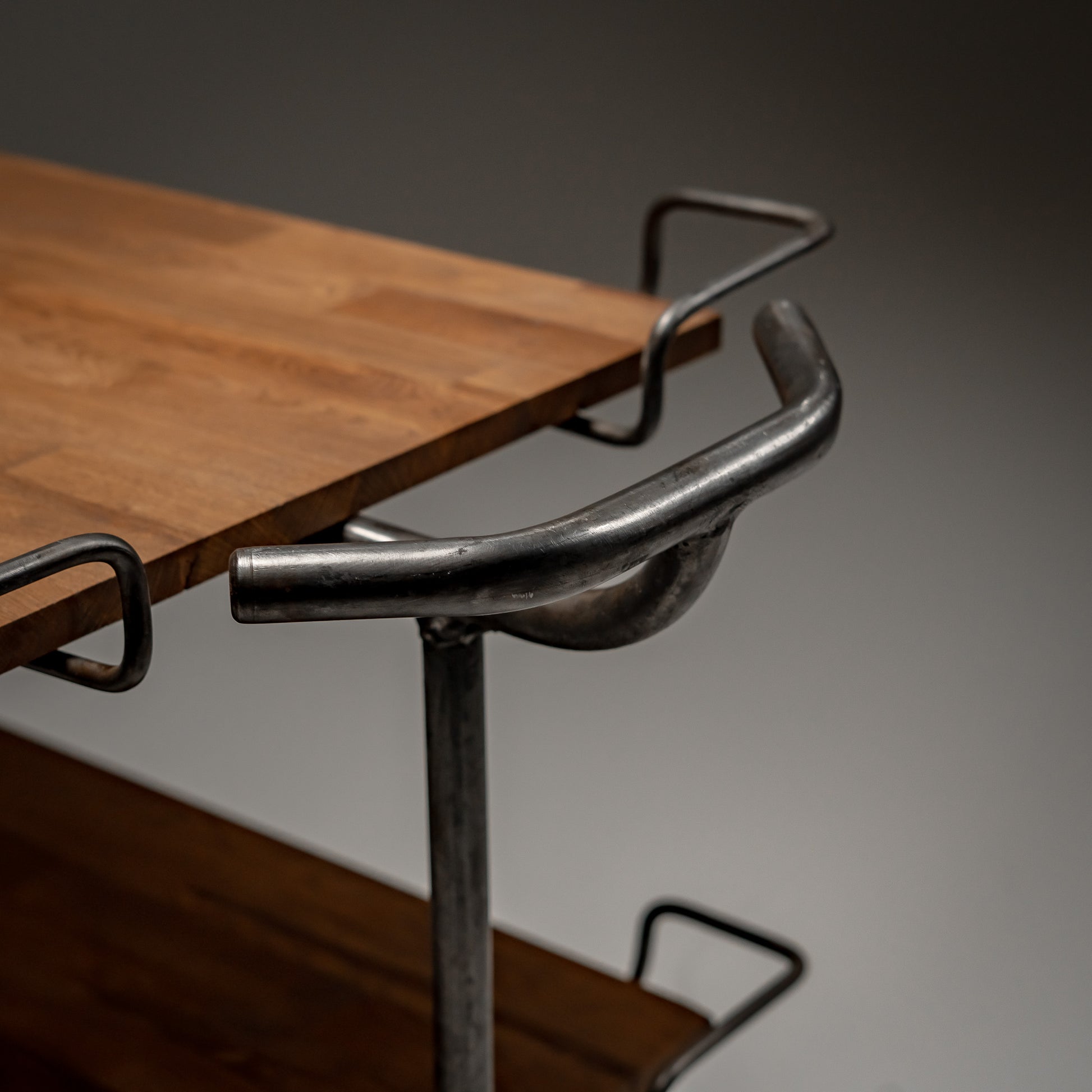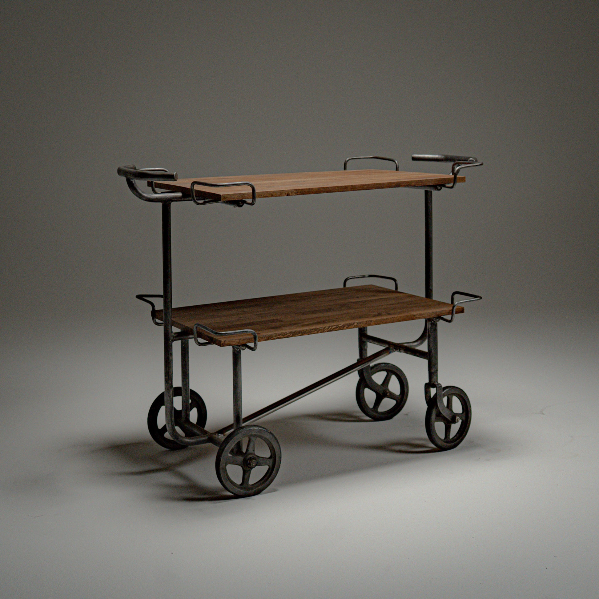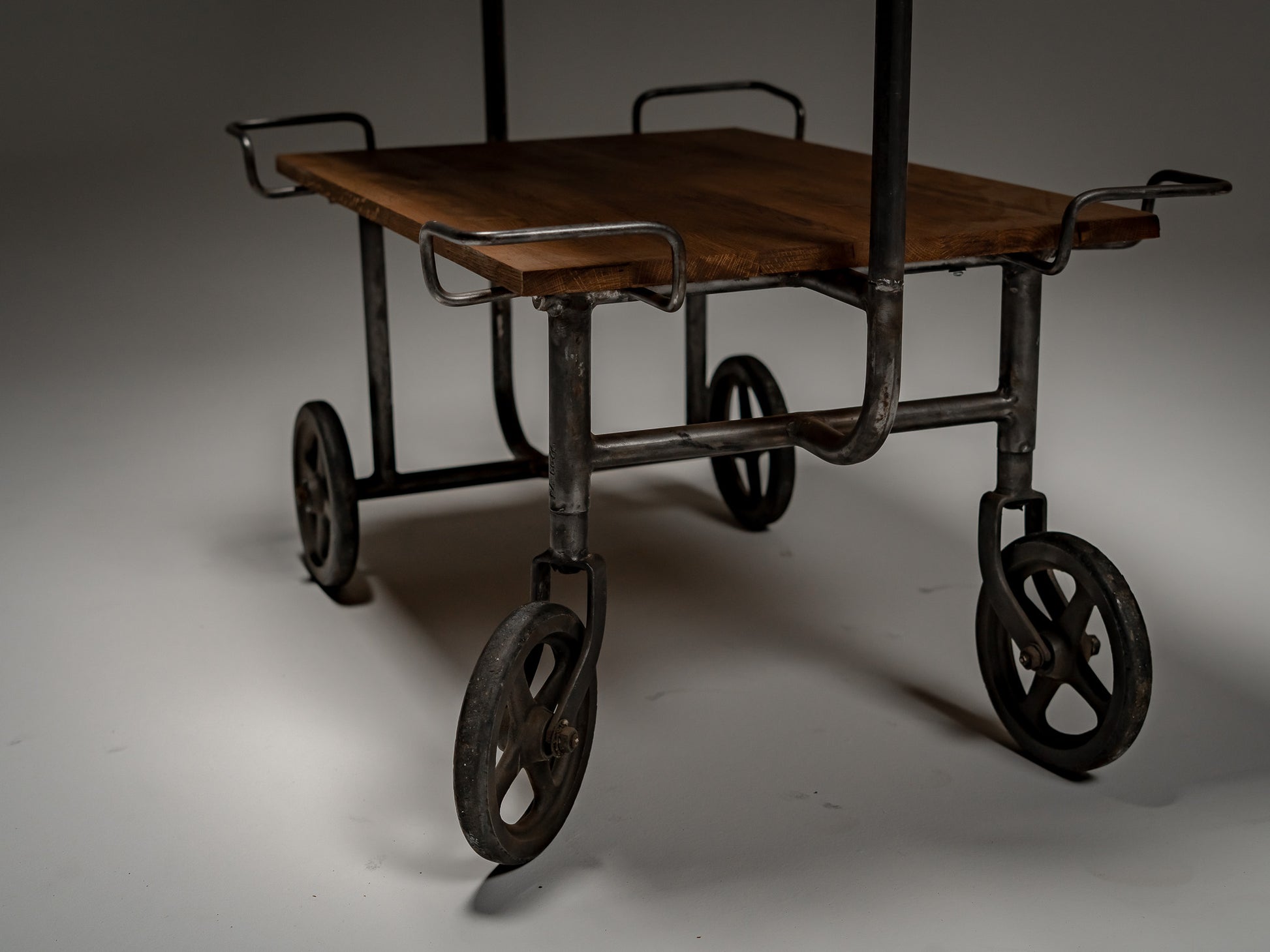 Stålrammen hviler på solide støpejernshjul, utviklet for stabilitet og jevn bevegelse over harde gulv. Proporsjonene er stramme og mekaniske. Hver sveis og hvert buede håndtak gjenspeiler medisinsk ingeniørkunst fra midten av det 20. århundre, der funksjon alltid gikk foran estetikk.