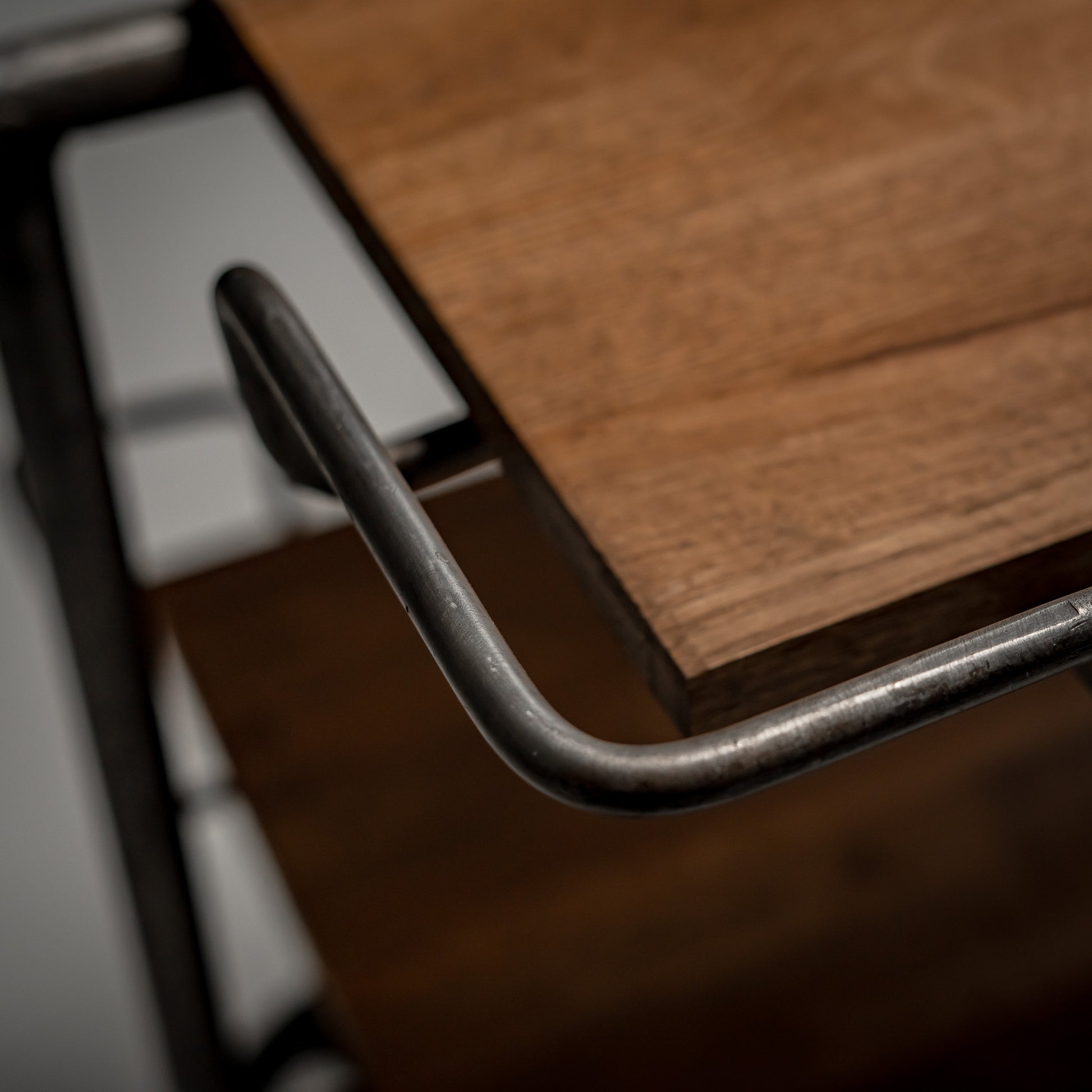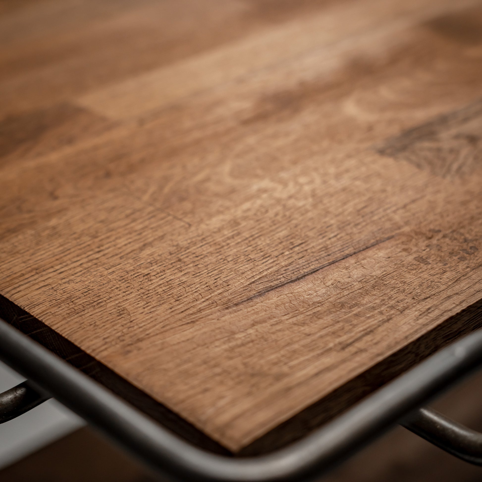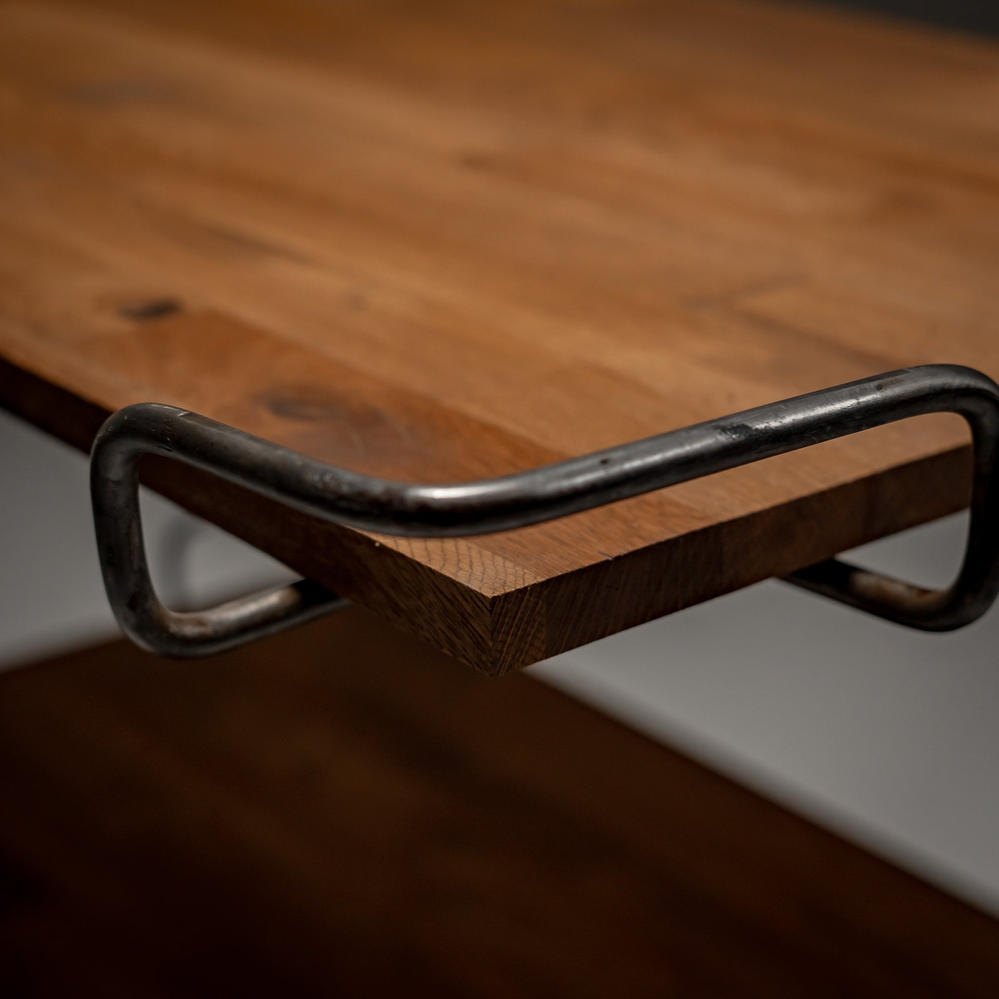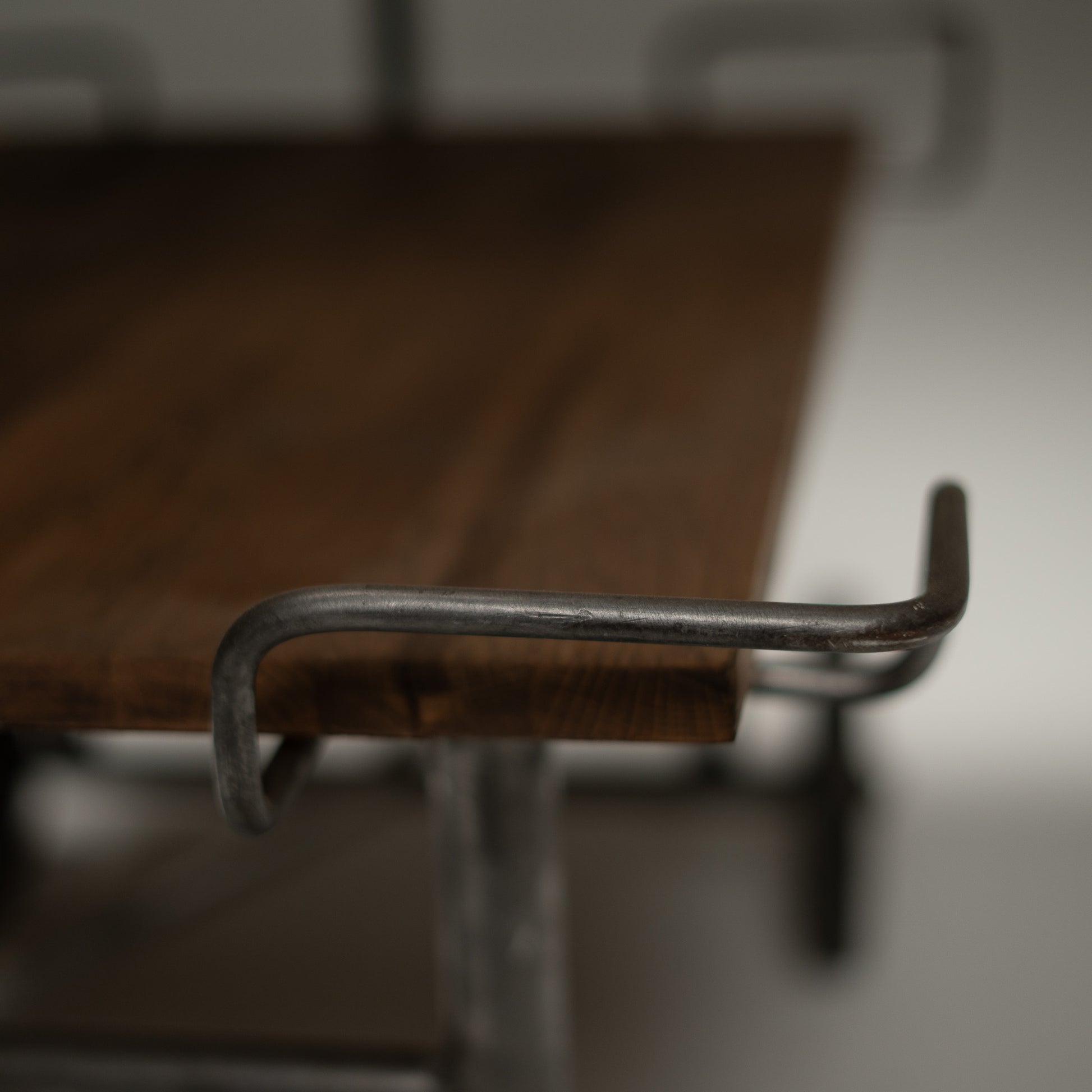 Nye hyller i heltre er montert og behandlet med hardvoksolje, som tilfører varme og materialkontrast mot det mørknede stålet. Inngrepet er bevisst og synlig. Gammelt og nytt eksisterer side om side uten imitasjon.