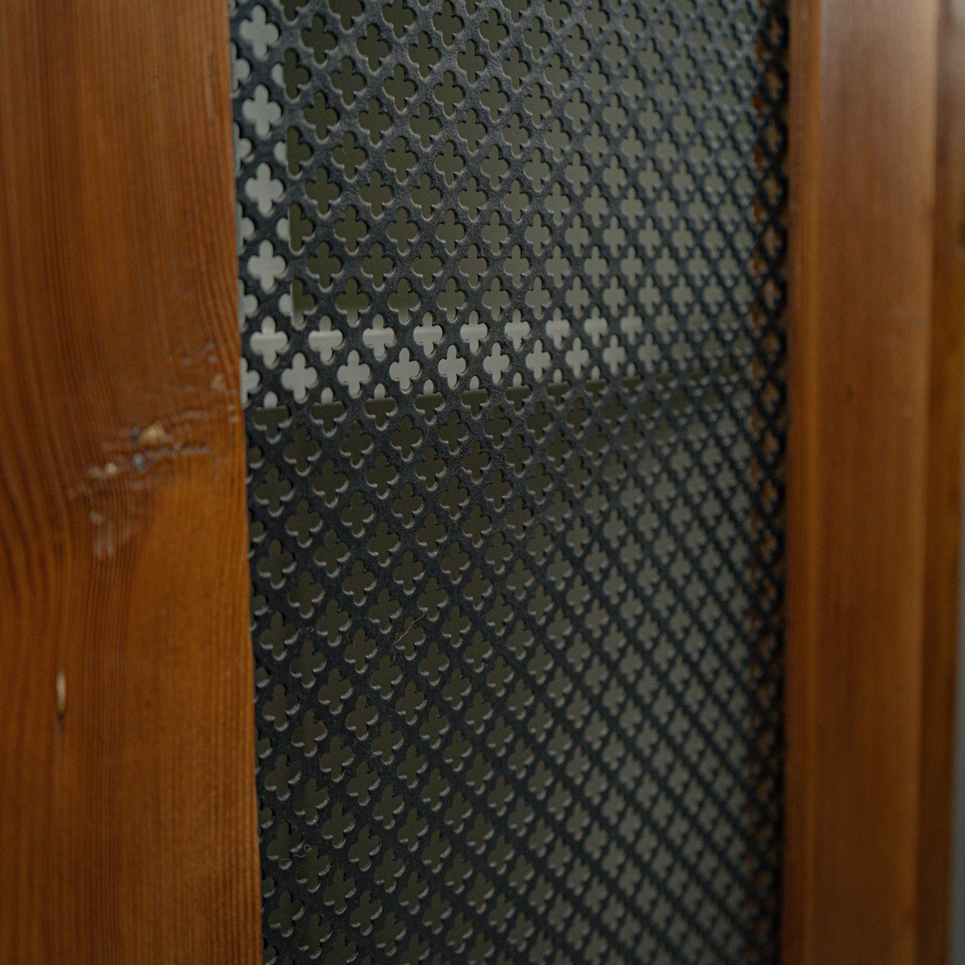 Under restaurering hos LetekCo ble de originale, massive dørpanelene erstattet med spesialtilpassede perforerte metallinnsatser med kløverbladmønster. Dette inngrepet reduserer det visuelle volumet samtidig som den opprinnelige konstruksjonen er bevart. Modifikasjonen er dokumentert.
