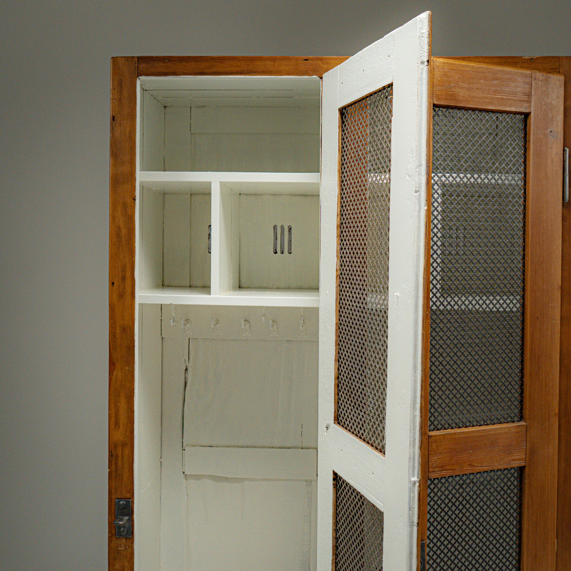 Dette høye garderobeskapet i tre er datert 1940 og tilskrives tysk militærinstitusjonell bruk under krigsårene. Bygget for holdbarhet og strengt funksjonelt bruk, reflekterer det de disiplinerte konstruksjonsstandardene som preget europeisk utstyr under krigen.